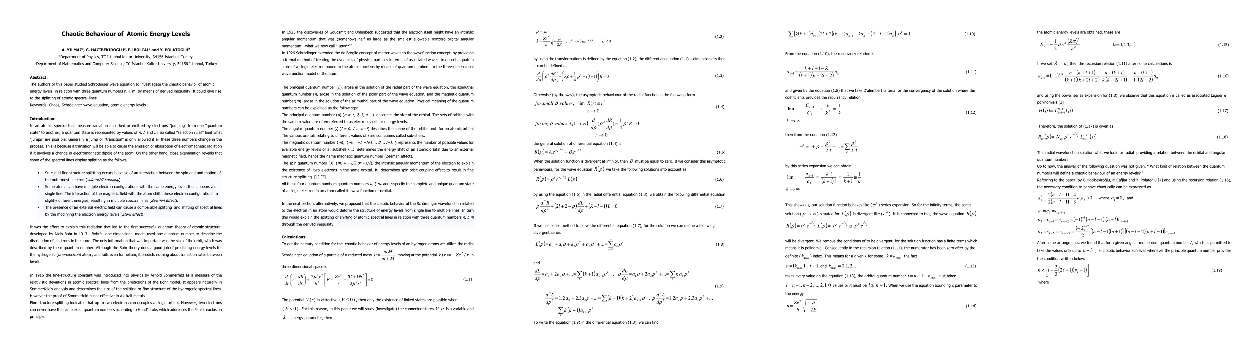 This paper investigates the chaotic behavior of atomic energy levels using the Schrödinger wave equation and derived inequalities related to quantum numbers n, l, m, potentially leading to the splitting of atomic spectral lines. Keywords include chaos, Schrödinger wave equation, and atomic energy levels.