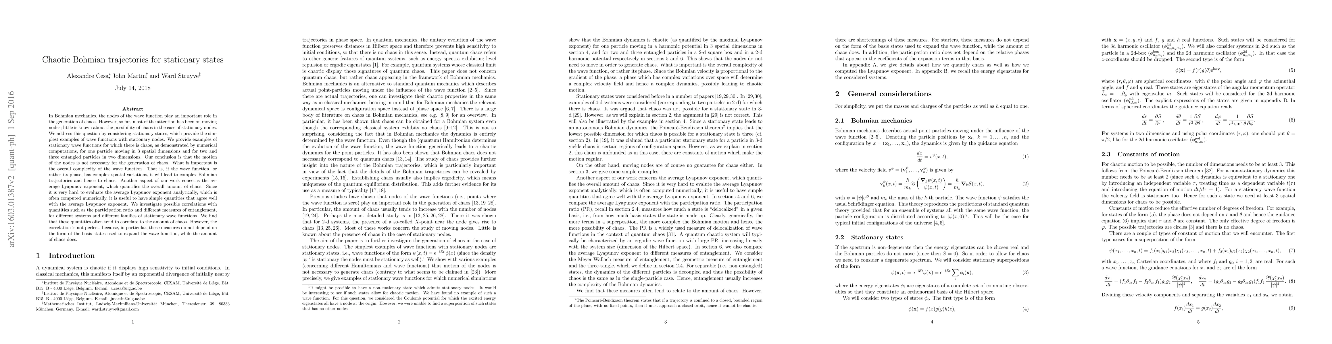 In Bohmian mechanics, the nodes of the wave function play an important role in the generation of chaos. However, so far, most of the attention has been on moving nodes; little is known about the possibility of chaos in the case of stationary nodes. We address this question by considering stationary states, which provide the simplest examples of wave functions with stationary nodes. We provide examples of stationary wave functions for which there is chaos, as demonstrated by numerical computations, for one particle moving in 3 spatial dimensions and for two and three entangled particles in two dimensions. Our conclusion is that the motion of the nodes is not necessary for the generation of chaos. What is important is the overall complexity of the wave function. That is, if the wave function, or rather its phase, has complex spatial variations, it will lead to complex Bohmian trajectories and hence to chaos. Another aspect of our work concerns the average Lyapunov exponent, which quantifies the overall amount of chaos. Since it is very hard to evaluate the average Lyapunov exponent analytically, which is often computed numerically, it is useful to have simple quantities that agree well with the average Lyapunov exponent. We investigate possible correlations with quantities such as the participation ratio and different measures of entanglement, for different systems and different families of stationary wave functions. We find that these quantities often tend to correlate to the amount of chaos. However, the correlation is not perfect, because, in particular, these measures do not depend on the form of the basis states used to expand the wave function, while the amount of chaos does.