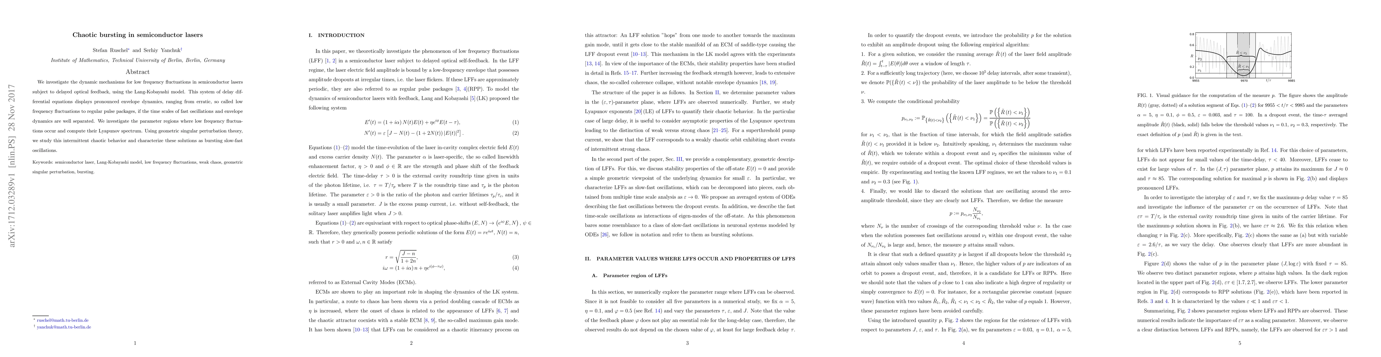 We investigate the dynamic mechanisms for low frequency fluctuations in semiconductor lasers subject to delayed optical feedback, using the Lang-Kobayashi model. This system of delay differential equations displays pronounced envelope dynamics, ranging from erratic, so called low frequency fluctuations to regular pulse packages, if the time scales of fast oscillations and envelope dynamics are well separated. We investigate the parameter regions where low frequency fluctuations occur and compute their Lyapunov spectrum. Using geometric singular perturbation theory, we study this intermittent chaotic behavior and characterize these solutions as bursting slow-fast oscillations.