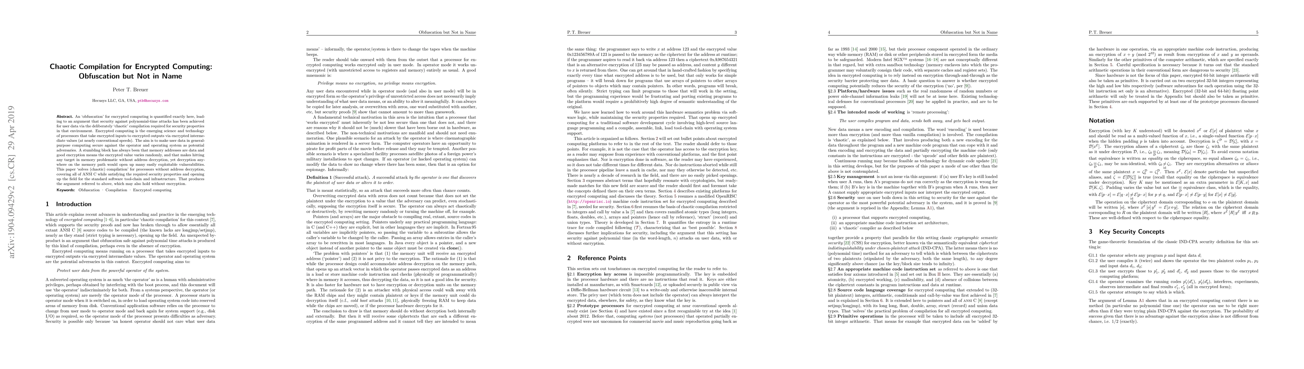 An `obfuscation' for encrypted computing is quantified exactly here, leading to an argument that security against polynomial-time attacks has been achieved for user data via the deliberately `chaotic' compilation required for security properties in that environment. Encrypted computing is the emerging science and technology of processors that take encrypted inputs to encrypted outputs via encrypted intermediate values (at nearly conventional speeds). The aim is to make user data in general-purpose computing secure against the operator and operating system as potential adversaries. A stumbling block has always been that memory addresses are data and good encryption means the encrypted value varies randomly, and that makes hitting any target in memory problematic without address decryption, yet decryption anywhere on the memory path would open up many easily exploitable vulnerabilities. This paper `solves (chaotic) compilation' for processors without address decryption, covering all of ANSI C while satisfying the required security properties and opening up the field for the standard software tool-chain and infrastructure. That produces the argument referred to above, which may also hold without encryption.