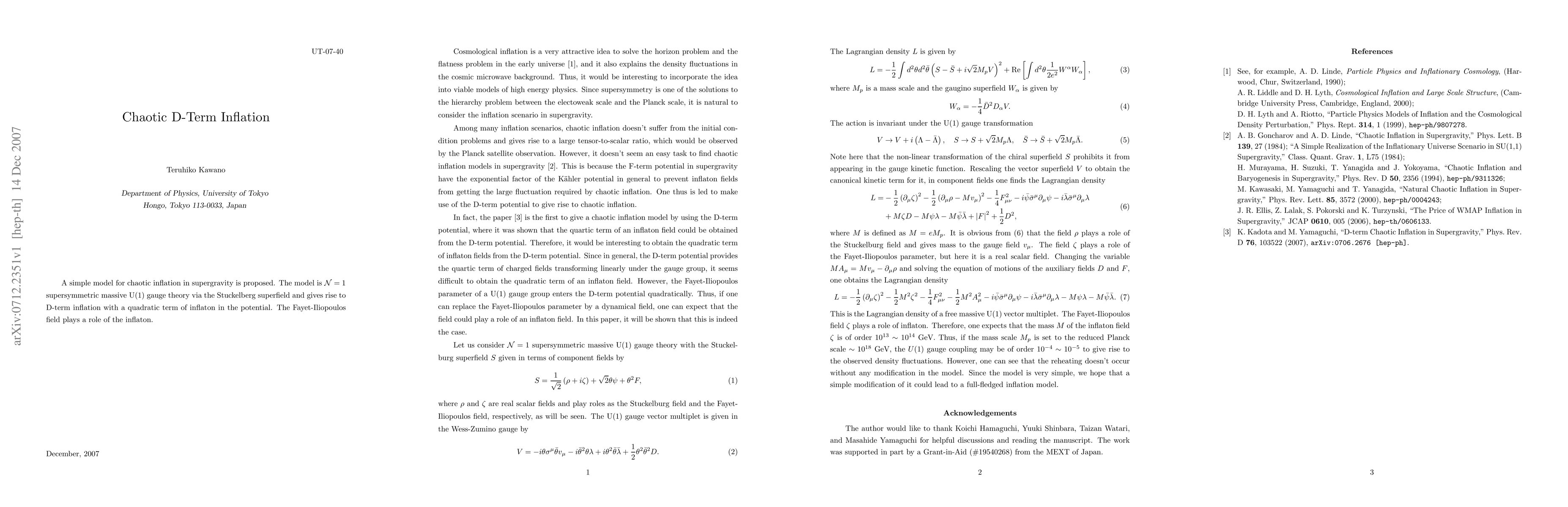 This paper proposes a supergravity model for chaotic inflation based on N=1 supersymmetric massive U(1) gauge theory, utilizing a Stuckelberg superfield. The Fayet-Iliopoulos field acts as the inflaton, leading to D-term inflation characterized by a quadratic potential term.