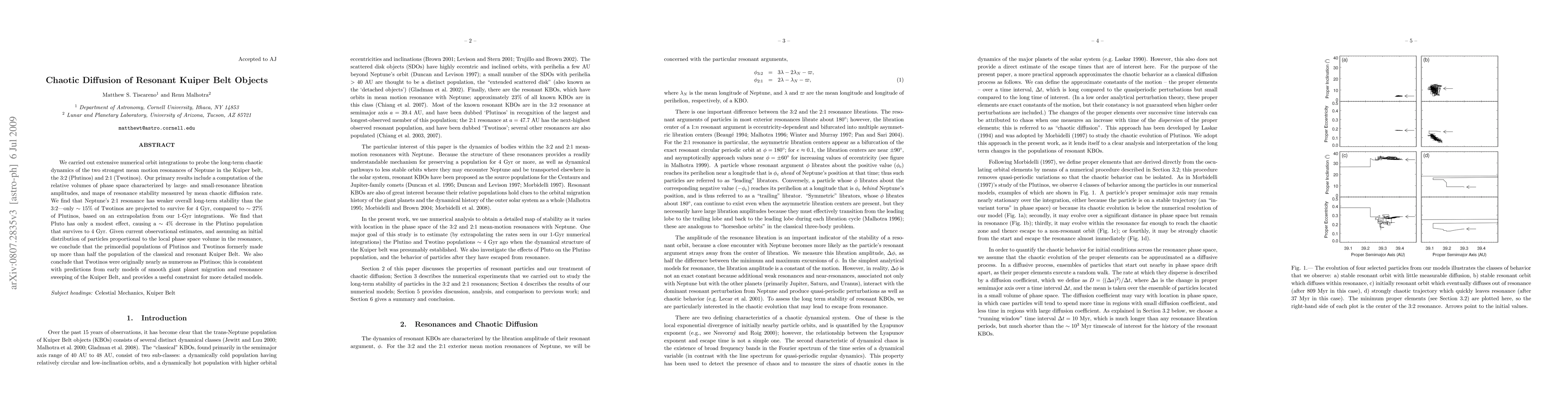This study investigates the long-term chaotic dynamics of Neptune's 3:2 and 2:1 mean motion resonances in the Kuiper Belt using numerical simulations. It finds that the 2:1 resonance (Twotinos) is less stable than the 3:2 (Plutinos), with only ~15% of Twotinos projected to survive 4 Gyr compared to ~27% of Plutinos.