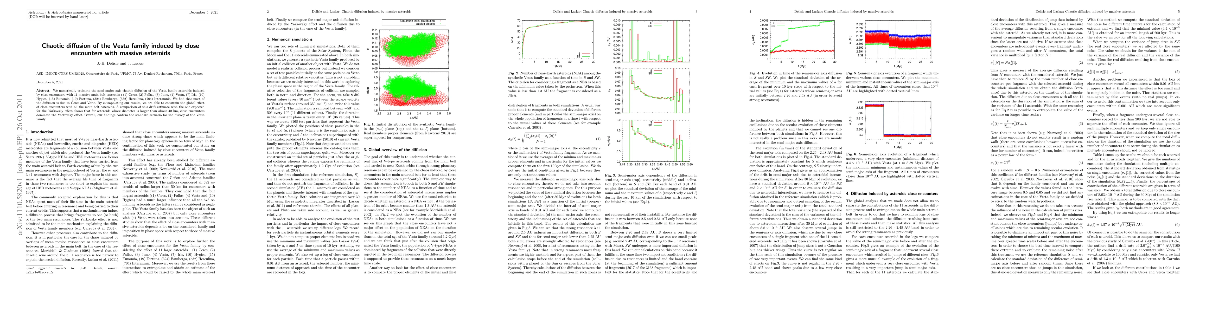 This paper investigates the chaotic diffusion of Vesta family asteroids due to close encounters with 11 massive main belt asteroids, finding Ceres and Vesta to be the primary drivers. The study concludes that for larger asteroids, close encounters significantly influence orbital dynamics more than the Yarkovsky effect.