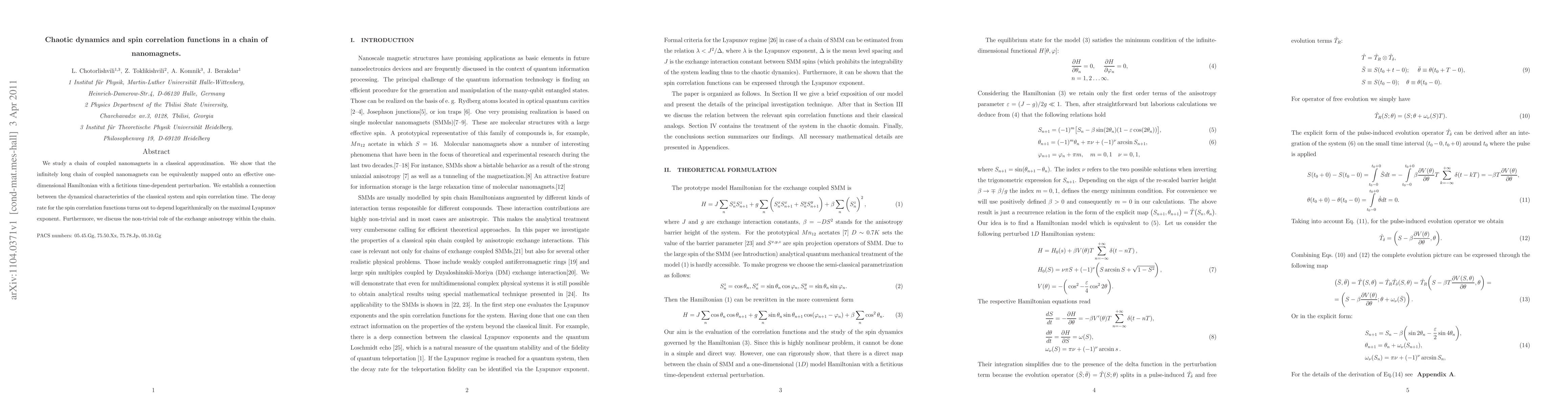 This paper explores chaotic dynamics in a chain of coupled nanomagnets, demonstrating that the system can be mapped onto an effective one-dimensional Hamiltonian. It finds a logarithmic relationship between the decay rate of spin correlation functions and the maximal Lyapunov exponent, highlighting the influence of exchange anisotropy.