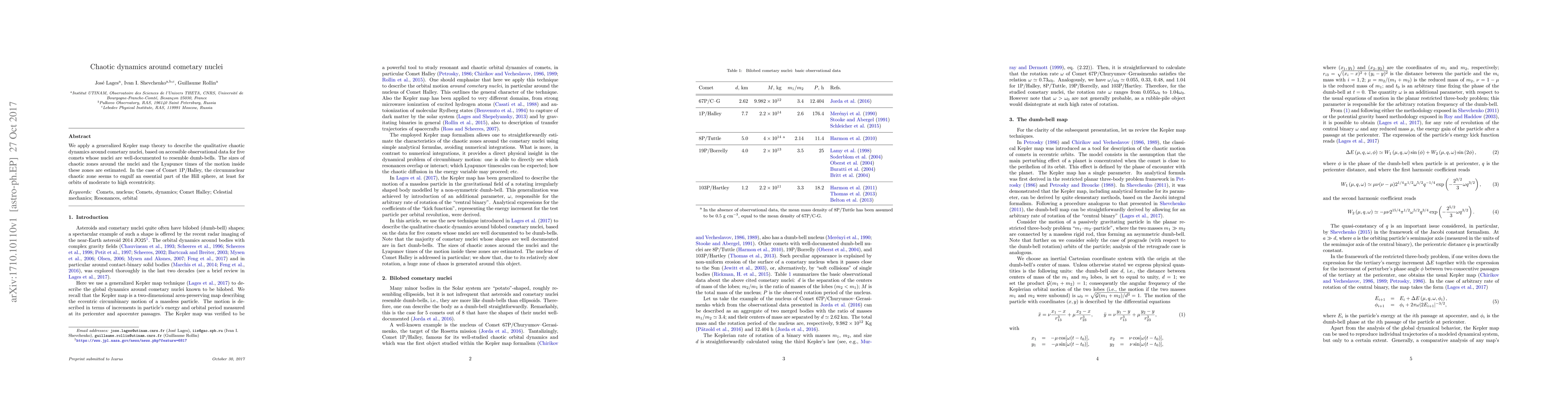 This paper uses a generalized Kepler map theory to analyze the chaotic dynamics around the nuclei of five well-documented cometary bodies, estimating the size of chaotic zones and Lyapunov times. For Comet 1P/Halley, the study finds that its chaotic zone significantly overlaps with its Hill sphere for moderate to high eccentricity orbits.
