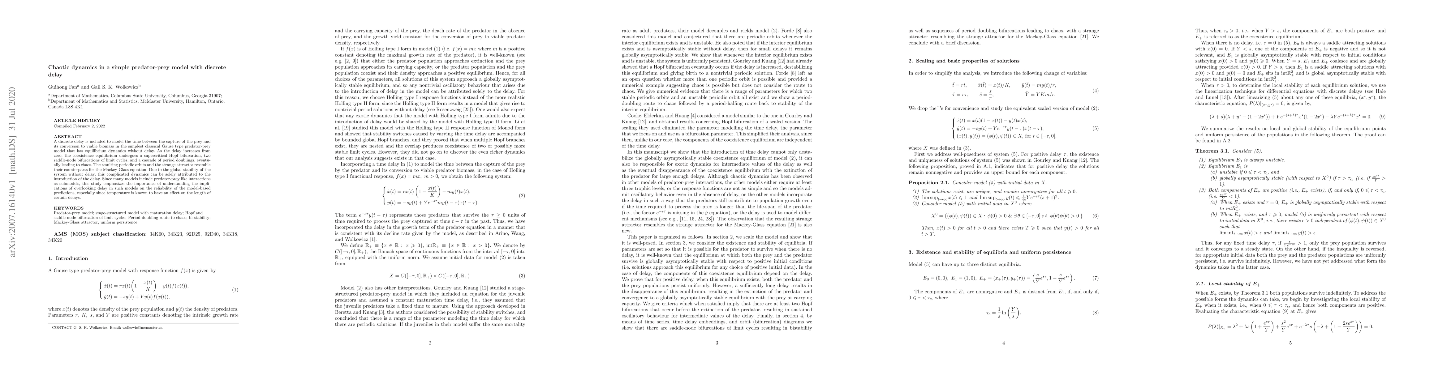 This paper investigates how introducing a discrete delay in a simple predator-prey model leads to complex dynamics, including chaos, through bifurcations and period doublings. The study highlights the critical impact of delay on model predictions, especially in ecological models where temperature affects delay durations.
