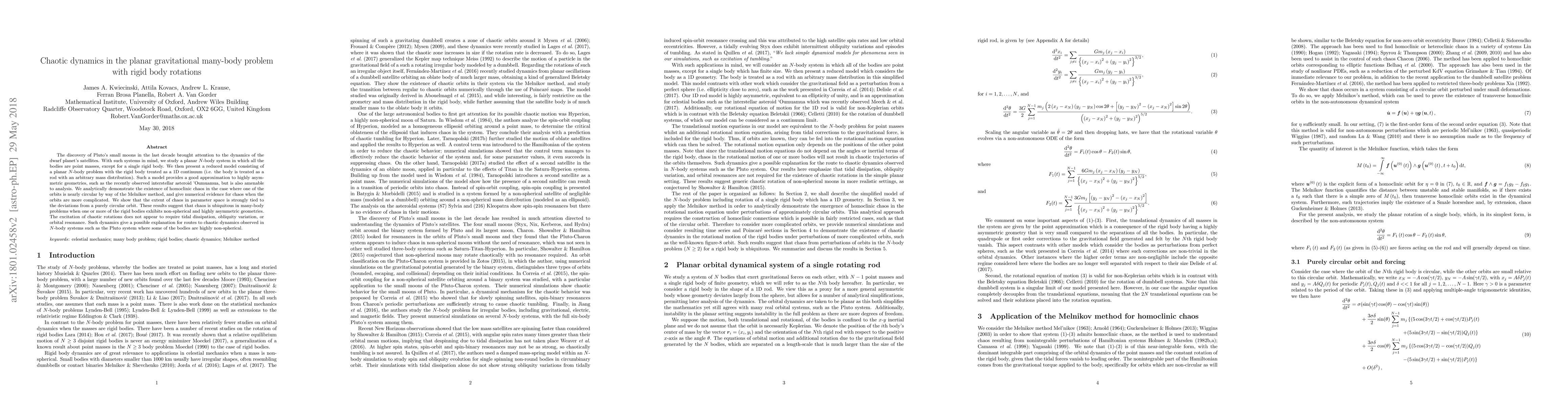 The discovery of Pluto's small moons in the last decade brought attention to the dynamics of the dwarf planet's satellites. With such systems in mind, we study a planar $N$-body system in which all the bodies are point masses, except for a single rigid body. We then present a reduced model consisting of a planar $N$-body problem with the rigid body treated as a 1D continuum (i.e. the body is treated as a rod with an arbitrary mass distribution). Such a model provides a good approximation to highly asymmetric geometries, such as the recently observed interstellar asteroid 'Oumuamua, but is also amenable to analysis. We analytically demonstrate the existence of homoclinic chaos in the case where one of the orbits is nearly circular by way of the Melnikov method, and give numerical evidence for chaos when the orbits are more complicated. We show that the extent of chaos in parameter space is strongly tied to the deviations from a purely circular orbit. These results suggest that chaos is ubiquitous in many-body problems when one or more of the rigid bodies exhibits non-spherical and highly asymmetric geometries. The excitation of chaotic rotations does not appear to require tidal dissipation, obliquity variation, or orbital resonance. Such dynamics give a possible explanation for routes to chaotic dynamics observed in $N$-body systems such as the Pluto system where some of the bodies are highly non-spherical.