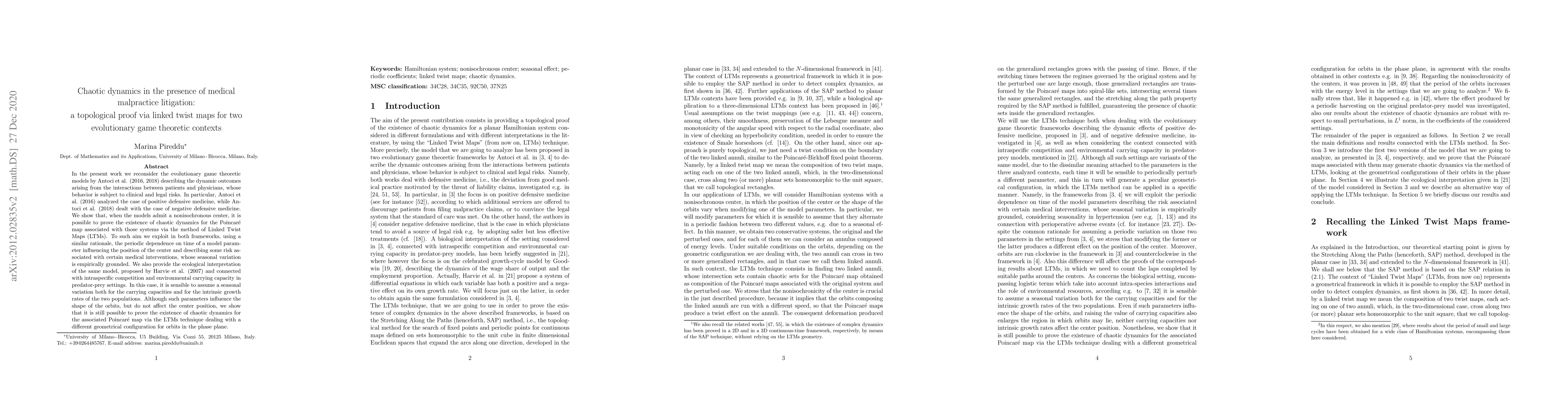 In the present work we reconsider the evolutionary game theoretic models by Antoci et al. (2016, 2018) describing the dynamic outcomes arising from the interactions between patients and physicians, whose behavior is subject to clinical and legal risks. In particular, Antoci et al. (2016) analyzed the case of positive defensive medicine, while Antoci et al. (2018) dealt with the case of negative defensive medicine. We show that, when the models admit a nonisochronous center, it is possible to prove the existence of chaotic dynamics for the Poincar\'e map associated with those systems via the method of Linked Twist Maps (LTMs). To such aim we exploit in both frameworks, using a similar rationale, the periodic dependence on time of a model parameter influencing the position of the center and describing some risk associated with certain medical interventions, whose seasonal variation is empirically grounded. We also provide the ecological interpretation of the same model, proposed by Harvie et al. (2007) and connected with intraspecific competition and environmental carrying capacity in predator-prey settings. In this case, it is sensible to assume a seasonal variation both for the carrying capacities and for the intrinsic growth rates of the two populations. Although such parameters influence the shape of the orbits, but do not affect the center position, we show that it is still possible to prove the existence of chaotic dynamics for the associated Poincar\'e map via the LTMs technique dealing with a different geometrical configuration for orbits in the phase plane.