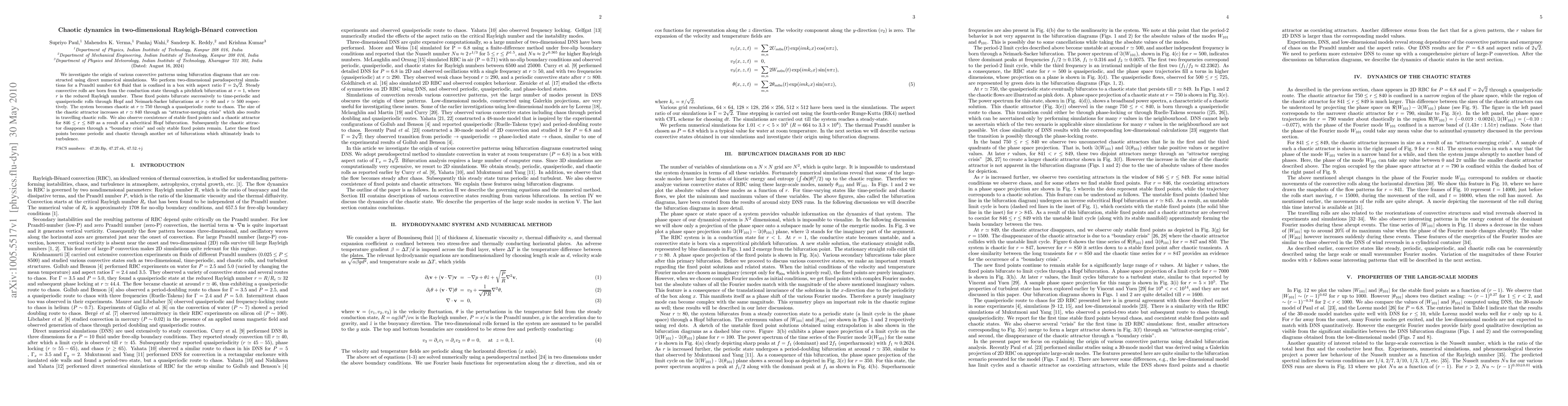 This paper explores the bifurcation pathways leading to chaotic dynamics in two-dimensional Rayleigh-Bénard convection, revealing a transition from steady rolls to chaos via Hopf and Neimark-Sacker bifurcations, and further complex behaviors including attractor merging and boundary crises.