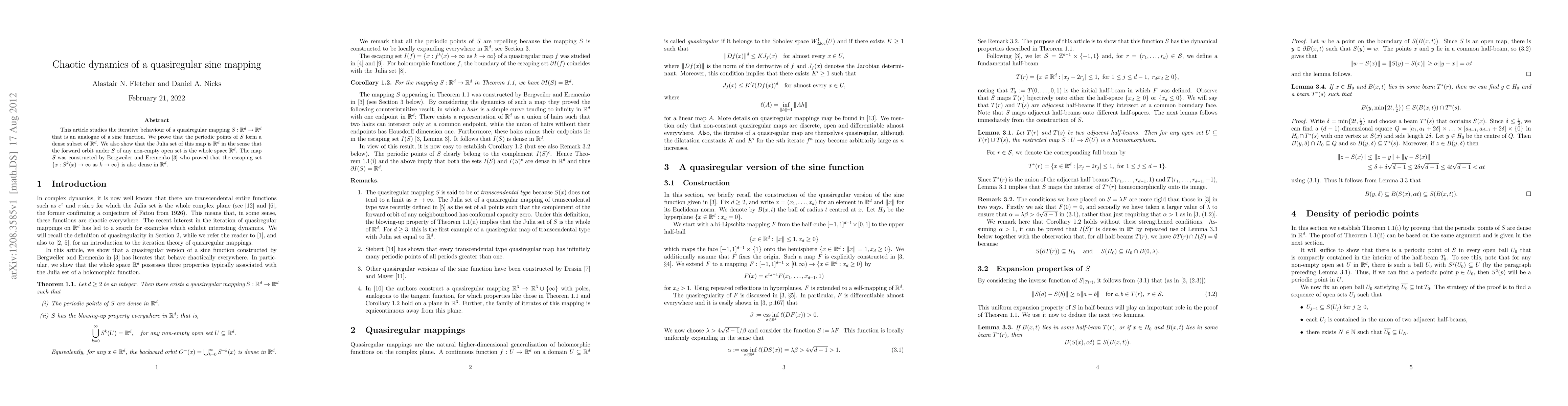 This paper investigates the chaotic dynamics of a quasiregular sine mapping, proving that its periodic points are dense in \(\mathbb{R}^d\) and that the Julia set spans the entire space \(\mathbb{R}^d\). The map was originally constructed by Bergweiler and Eremenko, demonstrating a dense escaping set.