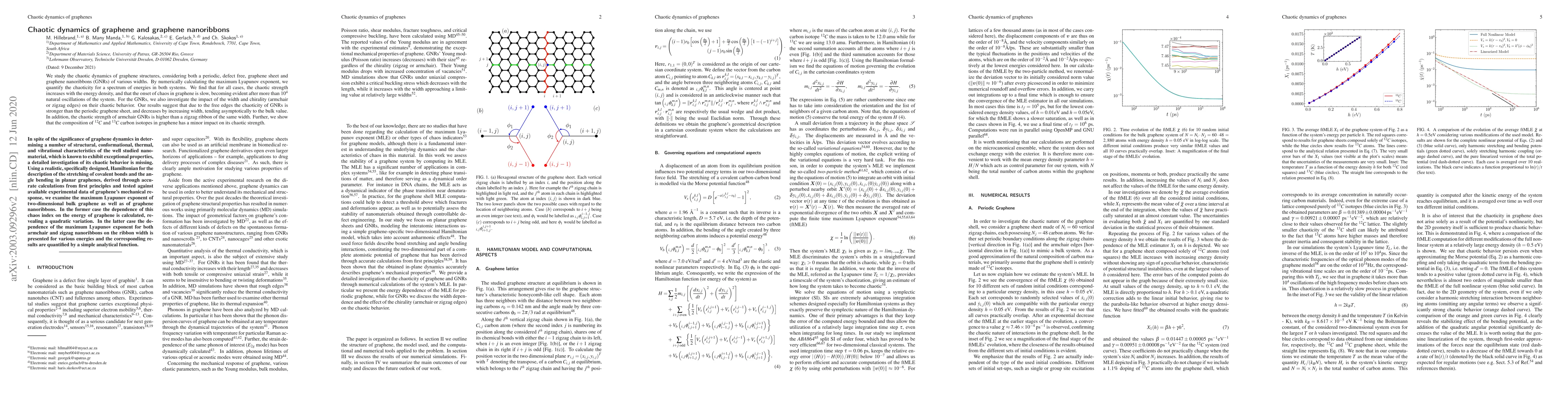 We study the chaotic dynamics of graphene structures, considering both a periodic, defect free, graphene sheet and graphene nanoribbons (GNRs) of various widths. By numerically calculating the maximum Lyapunov exponent, we quantify the chaoticity for a spectrum of energies in both systems. We find that for all cases, the chaotic strength increases with the energy density, and that the onset of chaos in graphene is slow, becoming evident after more than $10^4$ natural oscillations of the system. For the GNRs, we also investigate the impact of the width and chirality (armchair or zigzag edges) on their chaotic behavior. Our results suggest that due to the free edges the chaoticity of GNRs is stronger than the periodic graphene sheet, and decreases by increasing width, tending asymptotically to the bulk value. In addition, the chaotic strength of armchair GNRs is higher than a zigzag ribbon of the same width. Further, we show that the composition of ${}^{12}C$ and ${}^{13}C$ carbon isotopes in graphene has a minor impact on its chaotic strength.
