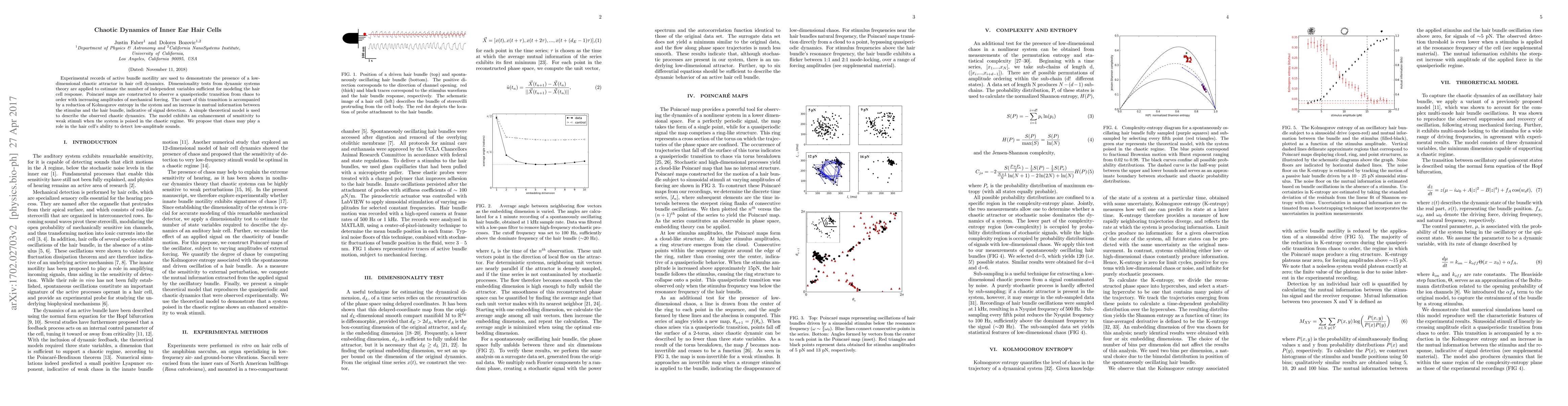 Experimental records of active bundle motility are used to demonstrate the presence of a low-dimensional chaotic attractor in hair cell dynamics. Dimensionality tests from dynamic systems theory are applied to estimate the number of independent variables sufficient for modeling the hair cell response. Poincare maps are constructed to observe a quasiperiodic transition from chaos to order with increasing amplitudes of mechanical forcing. The onset of this transition is accompanied by a reduction of Kolmogorov entropy in the system and an increase in mutual information between the stimulus and the hair bundle, indicative of signal detection. A simple theoretical model is used to describe the observed chaotic dynamics. The model exhibits an enhancement of sensitivity to weak stimuli when the system is poised in the chaotic regime. We propose that chaos may play a role in the hair cell's ability to detect low-amplitude sounds.