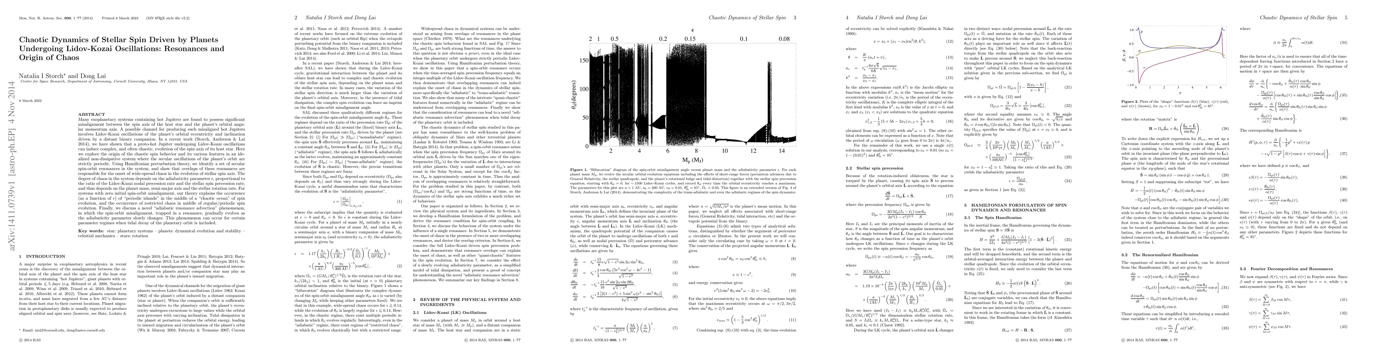 This paper investigates the chaotic dynamics of stellar spin influenced by planets experiencing Lidov-Kozai oscillations, identifying secular spin-orbit resonances as the origin of chaos. The study reveals how varying the planet mass, semi-major axis, and stellar rotation rate affects the degree of chaos, and introduces the concept of "adiabatic resonance advection" in systems with tidal decay.
