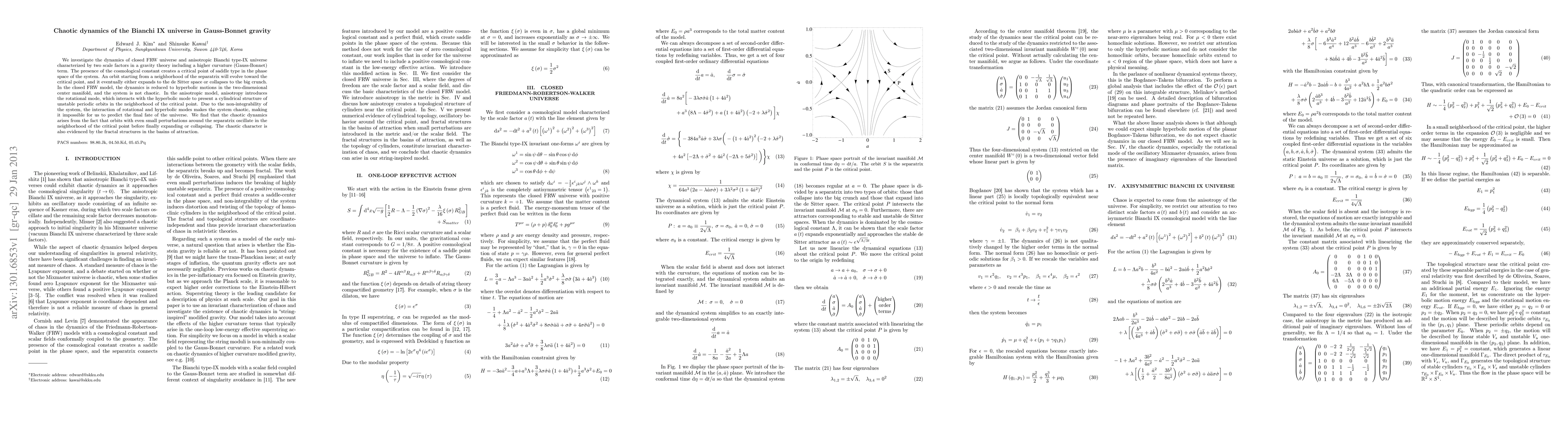 We investigate the dynamics of closed FRW universe and anisotropic Bianchi type-IX universe characterized by two scale factors in a gravity theory including a higher curvature (Gauss-Bonnet) term. The presence of the cosmological constant creates a critical point of saddle type in the phase space of the system. An orbit starting from a neighborhood of the separatrix will evolve toward the critical point, and it eventually either expands to the de Sitter space or collapses to the big crunch. In the closed FRW model, the dynamics is reduced to hyperbolic motions in the two-dimensional center manifold, and the system is not chaotic. In the anisotropic model, anisotropy introduces the rotational mode, which interacts with the hyperbolic mode to present a cylindrical structure of unstable periodic orbits in the neighborhood of the critical point. Due to the non-integrability of the system, the interaction of rotational and hyperbolic modes makes the system chaotic, making it impossible for us to predict the final fate of the universe. We find that the chaotic dynamics arises from the fact that orbits with even small perturbations around the separatrix oscillate in the neighborhood of the critical point before finally expanding or collapsing. The chaotic character is also evidenced by the fractal structures in the basins of attraction.