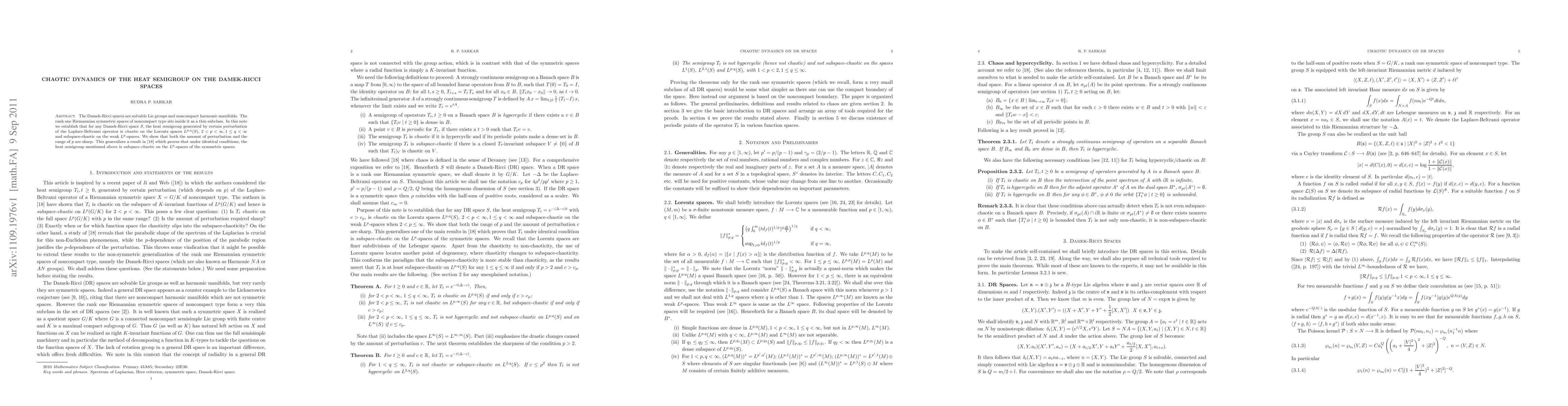 This paper investigates the chaotic dynamics of the heat semigroup on Damek-Ricci spaces, demonstrating its chaotic behavior on Lorentz spaces and subspace-chaotic on weak $L^p$-spaces. The study establishes the sharpness of perturbation and $p$ range, extending previous results on symmetric spaces.
