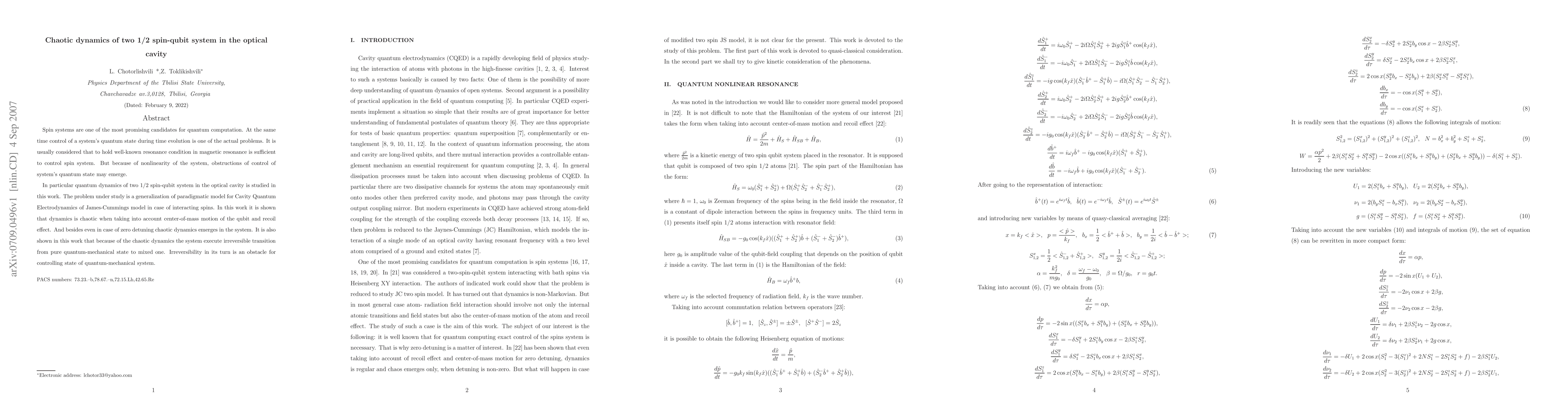 This paper investigates the chaotic dynamics of a two 1/2 spin-qubit system in an optical cavity, showing that even with zero detuning, chaotic behavior emerges due to center-of-mass motion and recoil effects. The study highlights that this chaos leads to irreversible transitions from pure to mixed quantum states, posing challenges for controlling the system's quantum state.