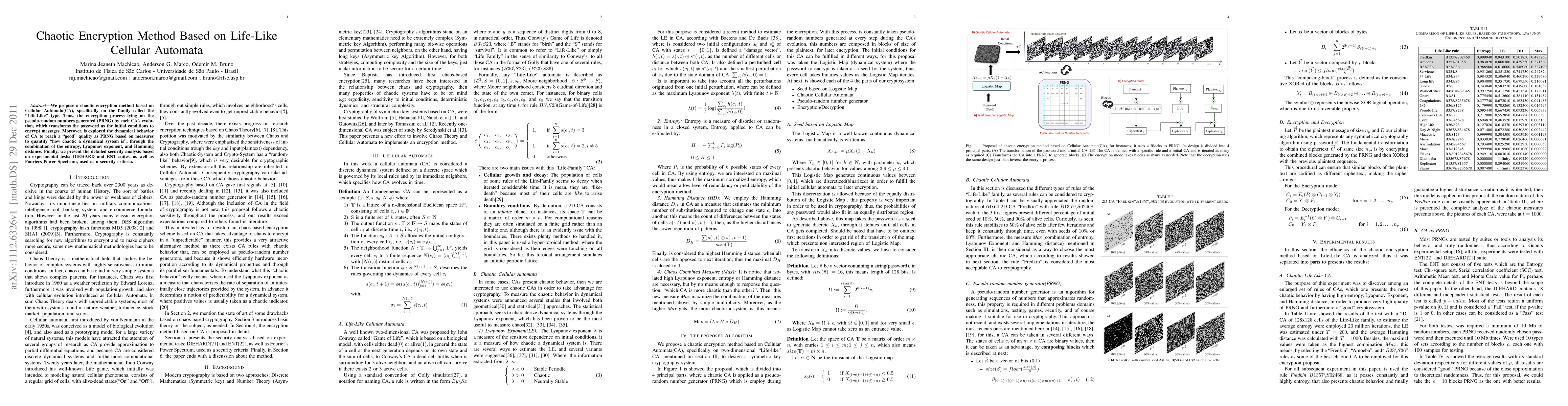 We propose a chaotic encryption method based on Cellular Automata(CA), specifically on the family called the "Life-Like" type. Thus, the encryption process lying on the pseudo-random numbers generated (PRNG) by each CA's evolution, which transforms the password as the initial conditions to encrypt messages. Moreover, is explored the dynamical behavior of CA to reach a "good" quality as PRNG based on measures to quantify "how chaotic a dynamical system is", through the combination of the entropy, Lyapunov exponent, and Hamming distance. Finally, we present the detailed security analysis based on experimental tests: DIEHARD and ENT suites, as well as Fouriers Power Spectrum, used as a security criteria.