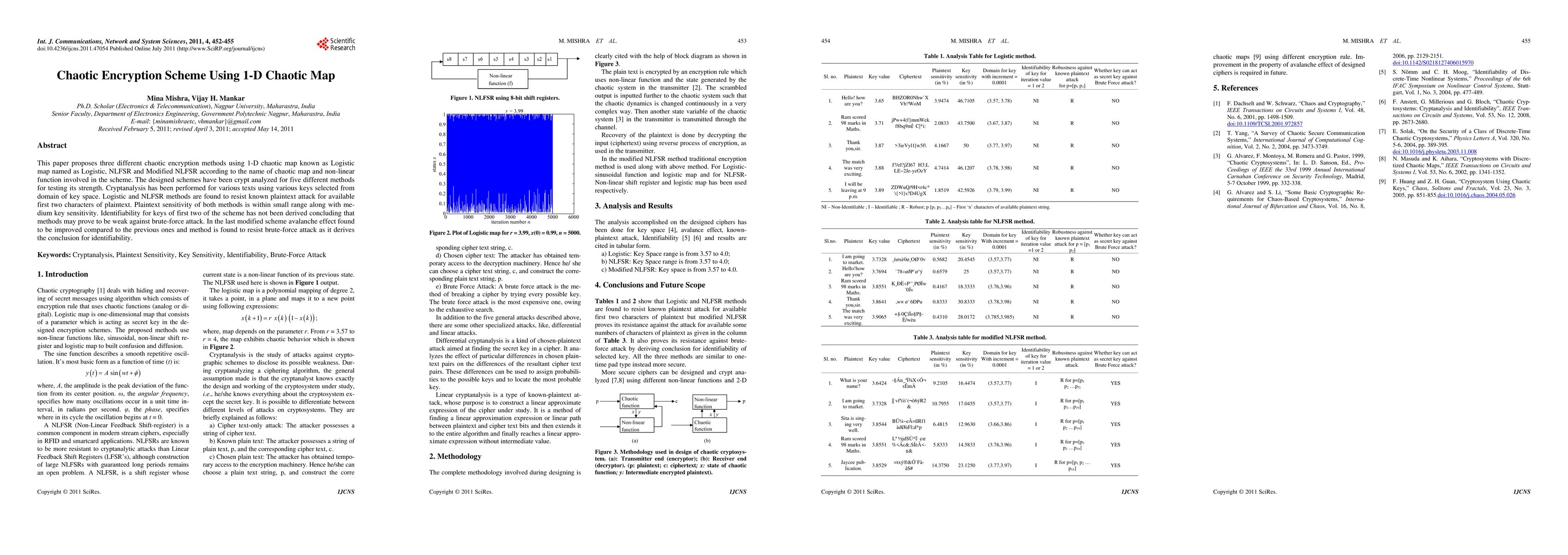 This paper proposes three different chaotic encryption methods using 1-D chaotic map known as Logistic map named as Logistic, NLFSR and Modified NLFSR according to the name of chaotic map and non-linear function involved in the scheme. The designed schemes have been crypt analyzed for five different methods for testing its strength. Cryptanalysis has been performed for various texts using various keys selected from domain of key space. Logistic and NLFSR methods are found to resist known plaintext attack for available first two characters of plaintext. Plaintext sensitivity of both methods is within small range along with medium key sensitivity. Identifiability for keys of first two of the scheme has not been derived concluding that methods may prove to be weak against brute-force attack. In the last modified scheme avalanche effect found to be improved compared to the previous ones and method is found to resist brute-force attack as it derives the conclusion for identifiability.
