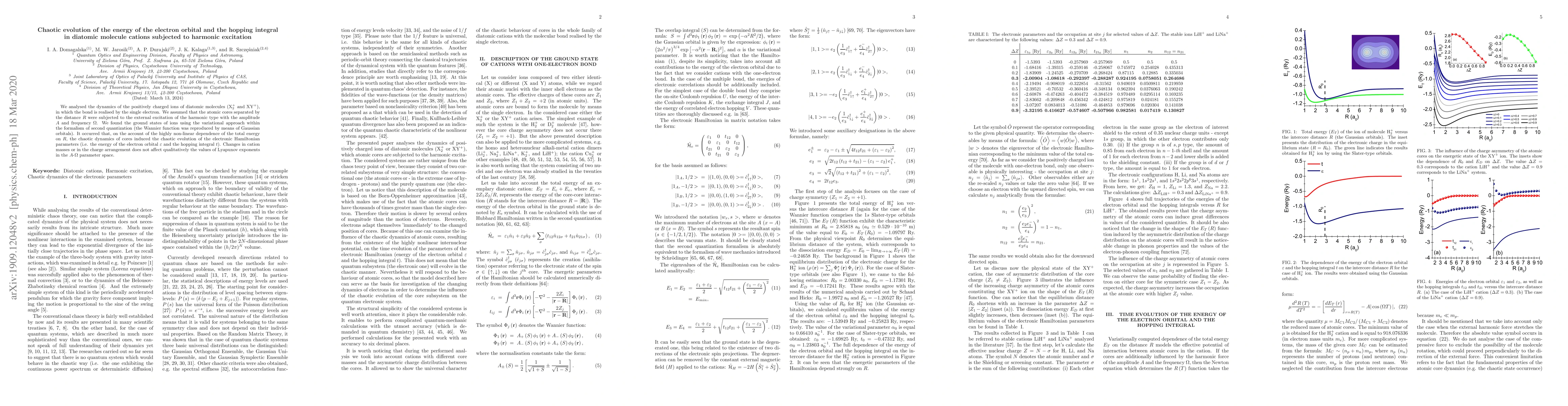 We analysed the dynamics of the positively charged ions of diatomic molecules (${\rm X_{2}^{+}}$ and ${\rm XY^{+}}$), in which the bond is realised by the single electron. We assumed that the atomic cores separated by the distance $R$ were subjected to the external excitation of the harmonic type with the amplitude $A$ and frequency $\Omega$. We found the ground states of ions using the variational approach within the formalism of second quantization (the Wannier function was reproduced by means of Gaussian orbitals). It occurred that, on the account of the highly non-linear dependence of the total energy on $R$, the chaotic dynamics of cores induced the chaotic evolution of the electronic Hamiltonian parameters (i.e. the energy of the electron orbital $\varepsilon$ and the hopping integral $t$). Changes in cation masses or in the charge arrangement does not affect qualitatively the values of Lyapunov exponents in the $A$-$\Omega$ parameter space.