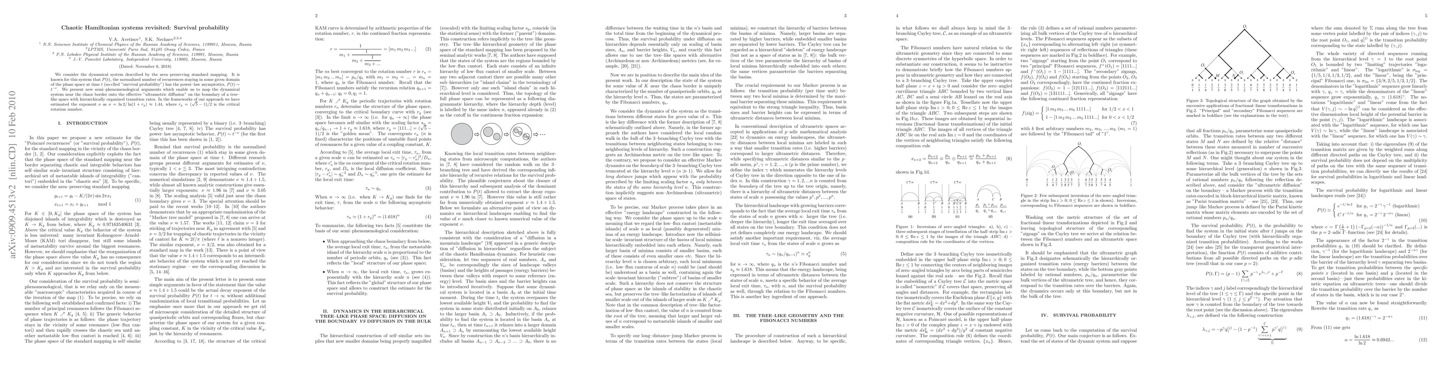 We consider the dynamical system described by the area--preserving standard mapping. It is known for this system that $P(t)$, the normalized number of recurrences staying in some given domain of the phase space at time $t$ (so-clled "survival probability") has the power--law asymptotics, $P(t)\sim t^{-\nu}$. We present new semi--phenomenological arguments which enable us to map the dynamical system near the chaos border onto the effective "ultrametric diffusion" on the boundary of a tree--like space with hierarchically organized transition rates. In the frameworks of our approach we have estimated the exponent $\nu$ as $\nu=\ln 2/\ln (1+r_g)\approx 1.44$, where $r_g=(\sqrt{5}-1)/2$ is the critical rotation number.
