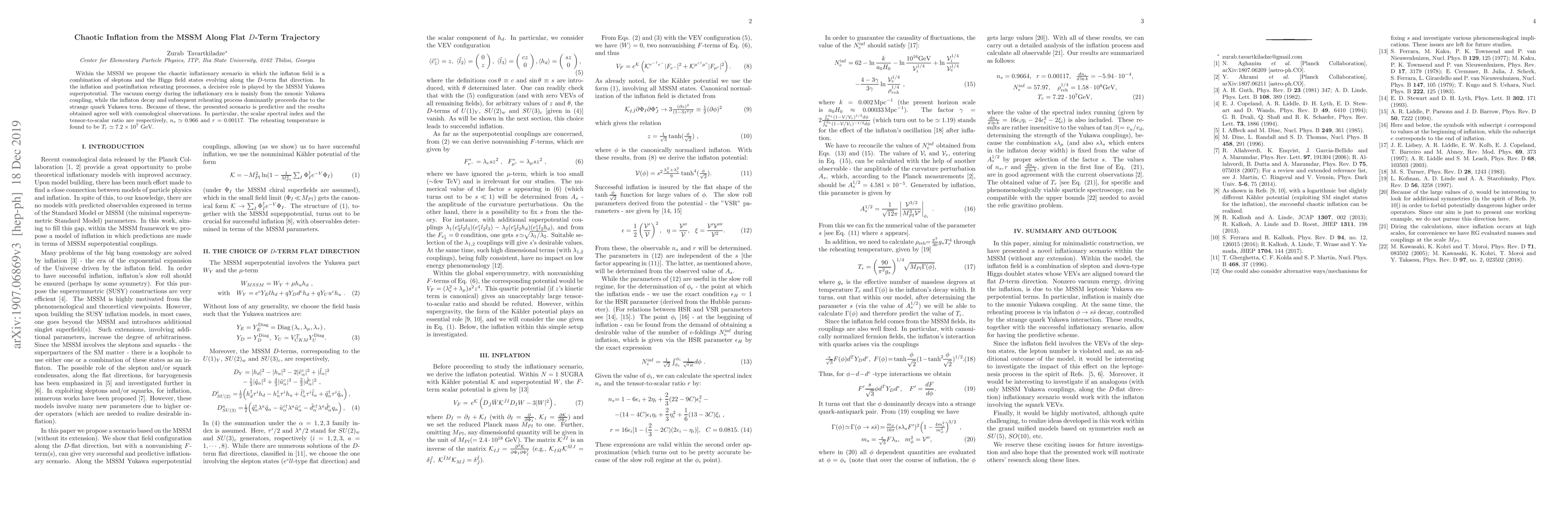 This paper proposes a chaotic inflationary model in the MSSM where the inflaton field combines sleptons and Higgs states along a $D$-term flat direction. The inflationary dynamics and reheating are driven by the MSSM Yukawa superpotential, yielding a scalar spectral index of $n_s \simeq 0.966$ and a tensor-to-scalar ratio of $r = 0.00117$, consistent with cosmological observations.