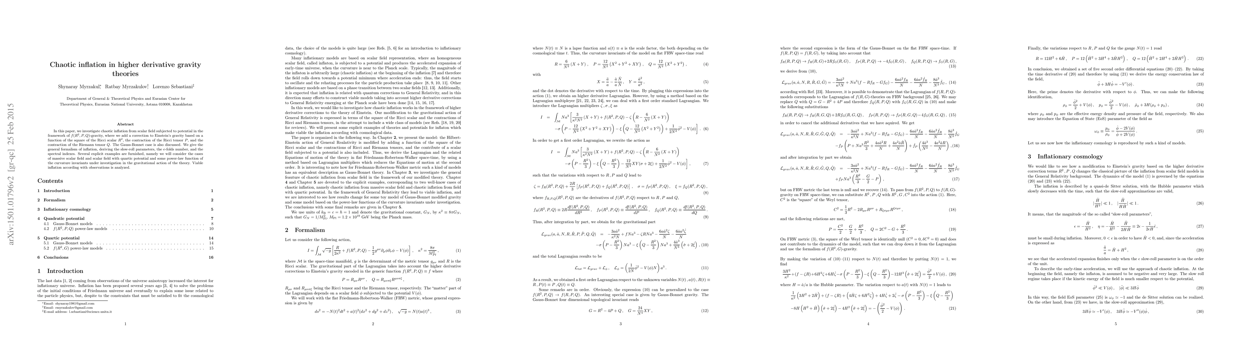 In this paper, we investigate chaotic inflation from scalar field subjected to potential in the framework of $f(R^2, P, Q)$-gravity, where we add a correction to Einstein's gravity based on a function of the square of the Ricci scalar $R^2$, the contraction of the Ricci tensor $P$, and the contraction of the Riemann tensor $Q$. The Gauss-Bonnet case is also discussed. We give the general formalism of inflation, deriving the slow-roll parameters, the $e$-folds number, and the spectral indexes. Several explicit examples are furnished, namely we will consider the cases of massive scalar field and scalar field with quartic potential and some power-law function of the curvature invariants under investigation in the gravitational action of the theory. Viable inflation according with observations is analyzed.