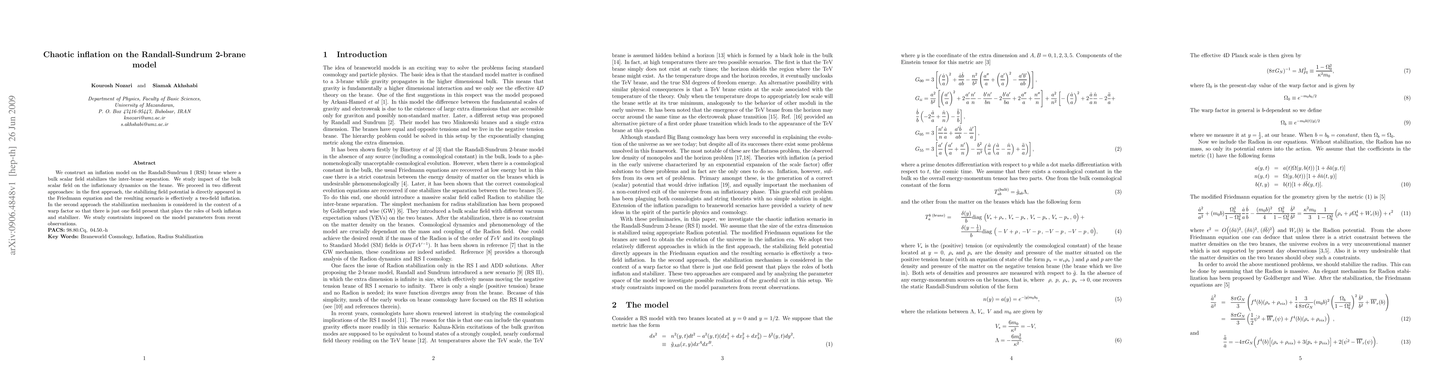This paper constructs an inflationary model on the Randall-Sundrum I brane using a bulk scalar field to stabilize the inter-brane separation. It explores two approaches: one treating the stabilization as a two-field inflation and the other as a single-field scenario with a warp factor, and analyzes observational constraints on the model parameters.