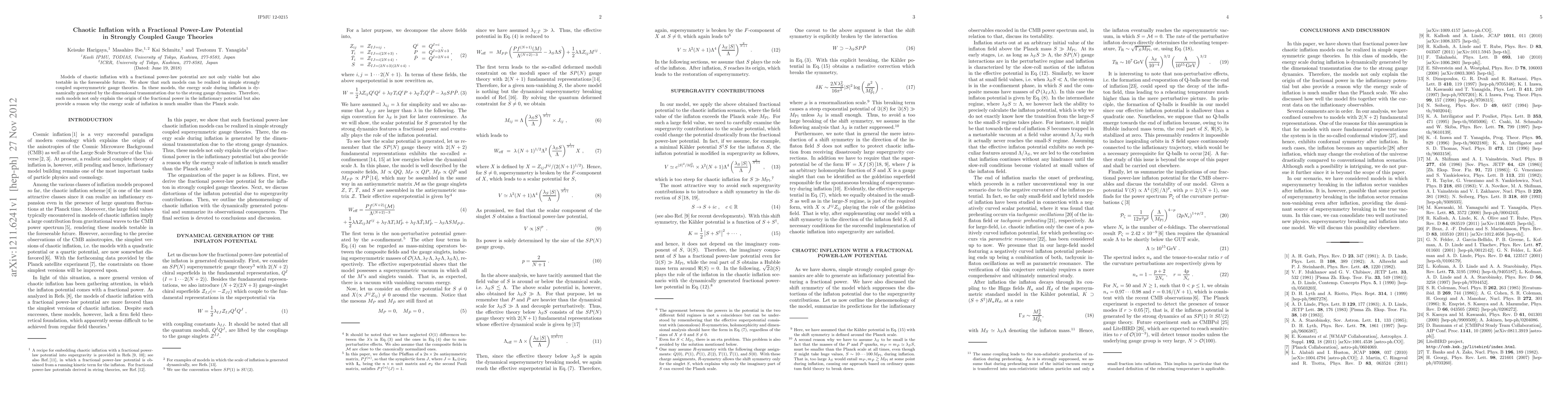 Summary: This paper explores chaotic inflation models using fractional power-law potentials in strongly coupled supersymmetric gauge theories, demonstrating that the energy scale of inflation is dynamically generated, explaining both the fractional power and the relatively low energy scale compared to the Planck scale.
