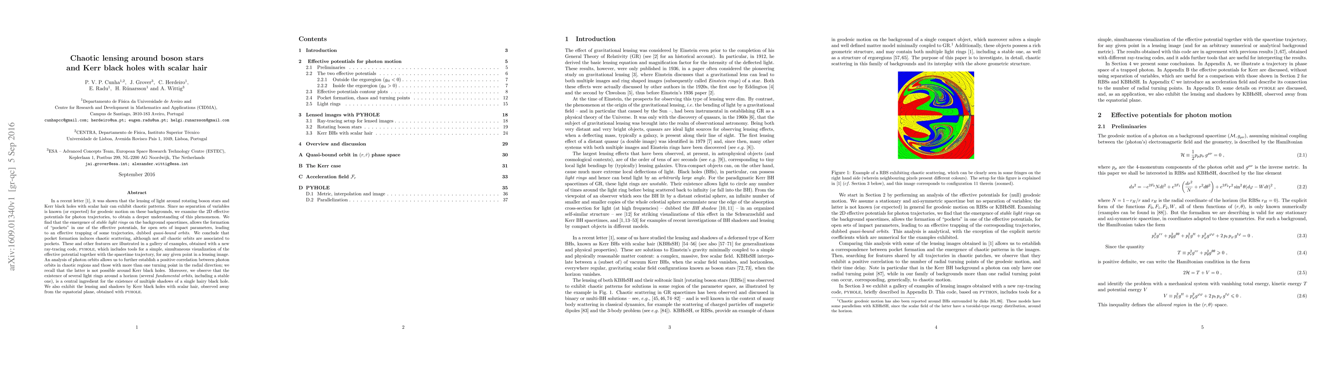 In a recent letter, arXiv:1509.00021, it was shown that the lensing of light around rotating boson stars and Kerr black holes with scalar hair can exhibit chaotic patterns. Since no separation of variables is known (or expected) for geodesic motion on these backgrounds, we examine the 2D effective potentials for photon trajectories, to obtain a deeper understanding of this phenomenon. We find that the emergence of stable light rings on the background spacetimes, allows the formation of "pockets" in one of the effective potentials, for open sets of impact parameters, leading to an effective trapping of some trajectories, dubbed quasi-bound orbits. We conclude that pocket formation induces chaotic scattering, although not all chaotic orbits are associated to pockets. These and other features are illustrated in a gallery of examples, obtained with a new ray-tracing code, PYHOLE, which includes tools for a simple, simultaneous visualization of the effective potential together with the spacetime trajectory, for any given point in a lensing image. An analysis of photon orbits allows us to further establish a positive correlation between photon orbits in chaotic regions and those with more than one turning point in the radial direction; we recall that the latter is not possible around Kerr black holes. Moreover, we observe that the existence of several light rings around a horizon (several fundamental orbits, including a stable one), is a central ingredient for the existence of multiple shadows of a single hairy black hole. We also exhibit the lensing and shadows by Kerr black holes with scalar hair, observed away from the equatorial plane, obtained with PYHOLE.