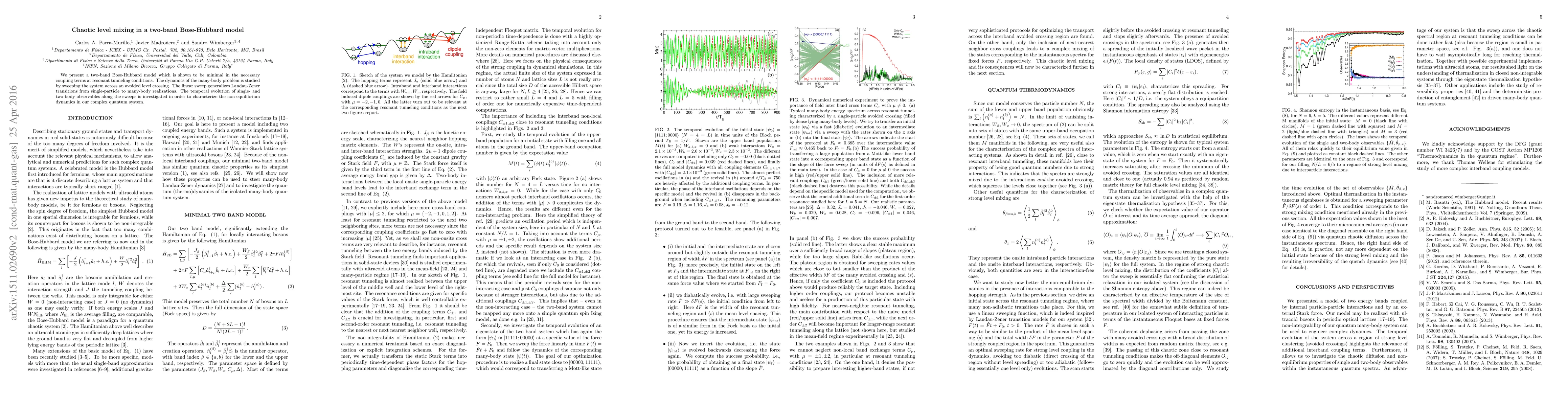 This research investigates a two-band Bose-Hubbard model under resonant tunneling conditions, exploring its chaotic level mixing via a linear sweep across an avoided level crossing, and characterizing the resulting non-equilibrium dynamics through the temporal evolution of single- and two-body observables.