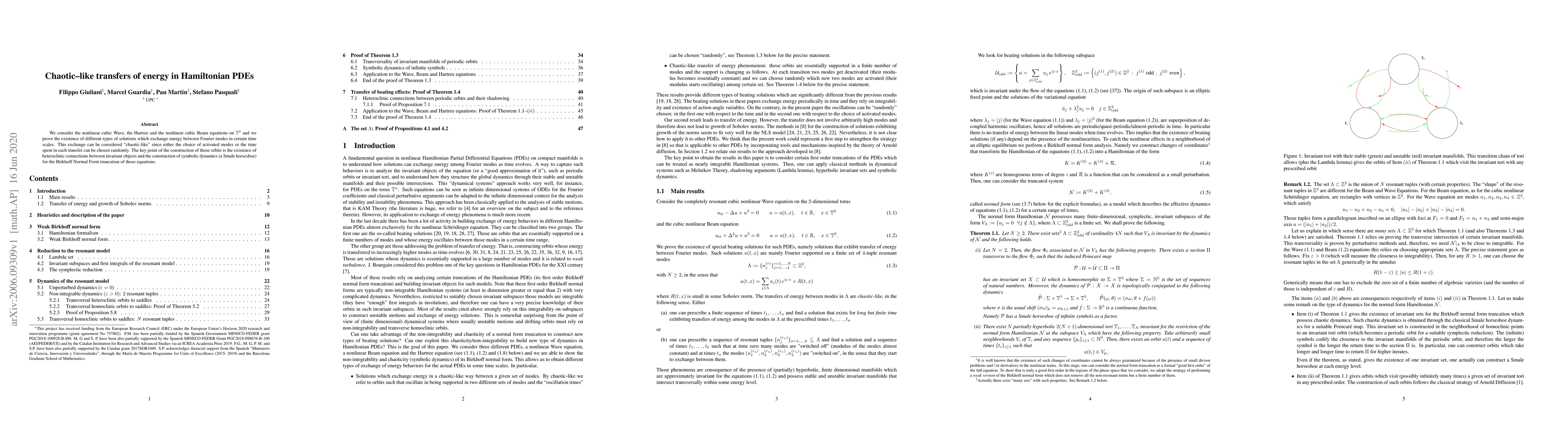We consider the nonlinear cubic Wave, the Hartree and the nonlinear cubic Beam equations on $T^2$ and we prove the existence of different types of solutions which exchange energy between Fourier modes in certain time scales. This exchange can be considered \emph{chaotic-like} since either the choice of activated modes or the time spent in each transfer can be chosen randomly. The key point of the construction of those orbits is the existence of heteroclinic connections between invariant objects and the construction of symbolic dynamics (a Smale horseshoe) for the Birkhoff Normal Form truncation of those equations.