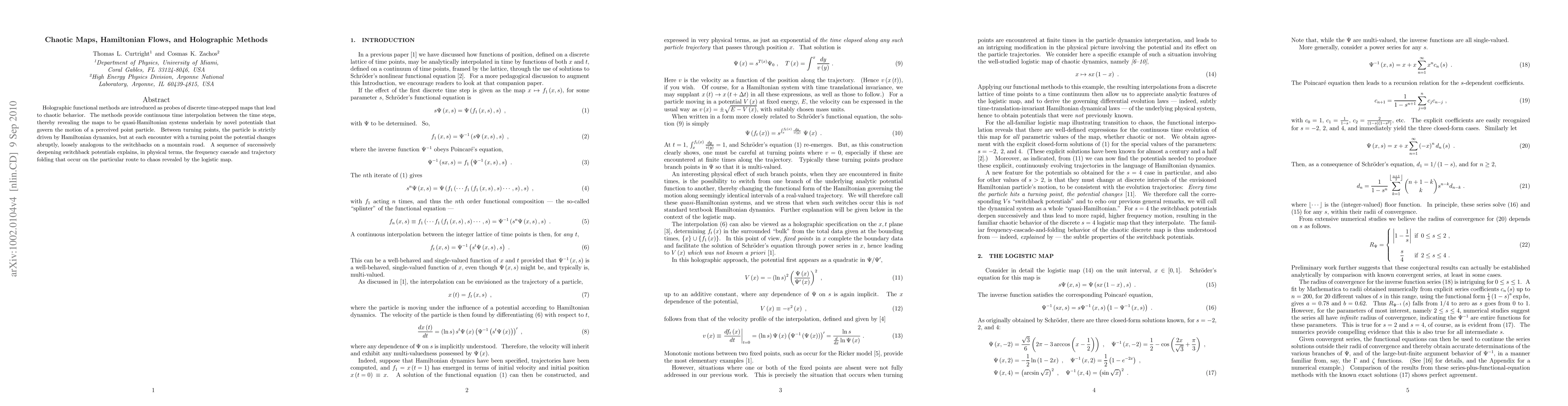 Holographic functional methods are introduced as probes of discrete time-stepped maps that lead to chaotic behavior. The methods provide continuous time interpolation between the time steps, thereby revealing the maps to be quasi-Hamiltonian systems underlain by novel potentials that govern the motion of a perceived point particle. Between turning points, the particle is strictly driven by Hamiltonian dynamics, but at each encounter with a turning point the potential changes abruptly, loosely analogous to the switchbacks on a mountain road. A sequence of successively deepening switchback potentials explains, in physical terms, the frequency cascade and trajectory folding that occur on the particular route to chaos revealed by the logistic map.