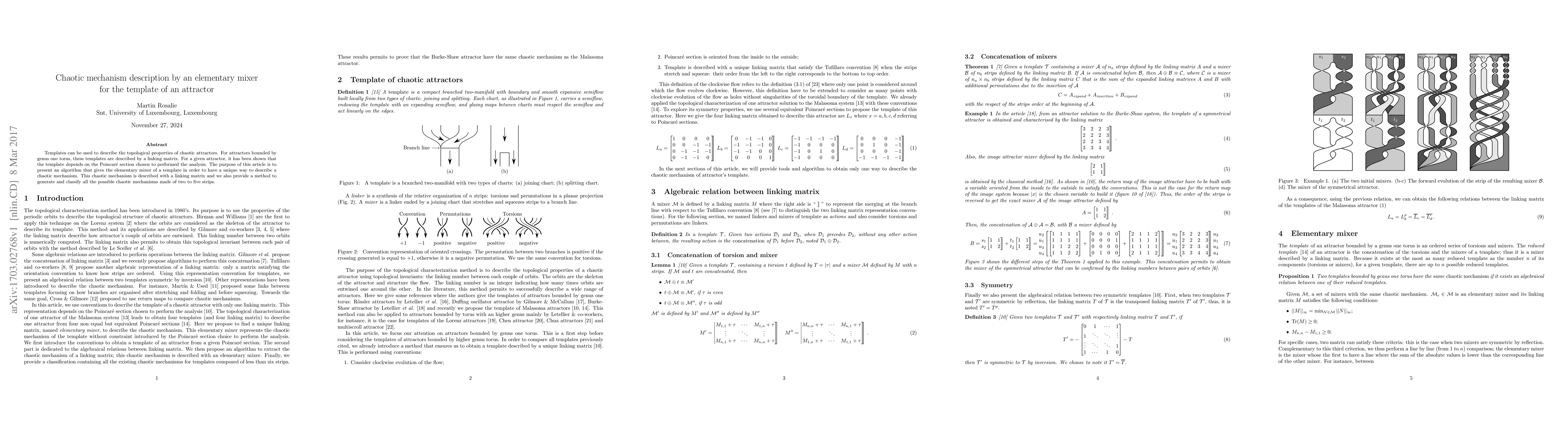 Templates can be used to describe the topological properties of chaotic attractors. For attractors bounded by genus one torus, these templates are described by a linking matrix. For a given attractor, it has been shown that the template depends on the Poincar\'e section chosen to performed the analysis. The purpose of this article is to present an algorithm that gives the elementary mixer of a template in order to have a unique way to describe a chaotic mechanism. This chaotic mechanism is described with a linking matrix and we also provide a method to generate and classify all the possible chaotic mechanisms made of two to five strips.