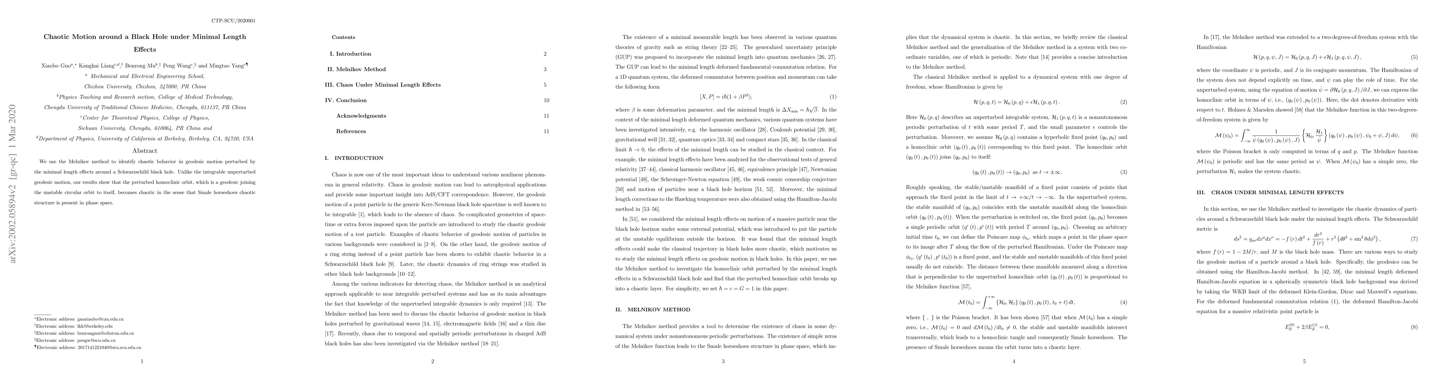 This paper employs the Melnikov method to demonstrate chaotic motion in geodesics around a Schwarzschild black hole, influenced by minimal length effects. The study reveals that the perturbed homoclinic orbit exhibits chaotic behavior, characterized by a Smale horseshoe structure in phase space.