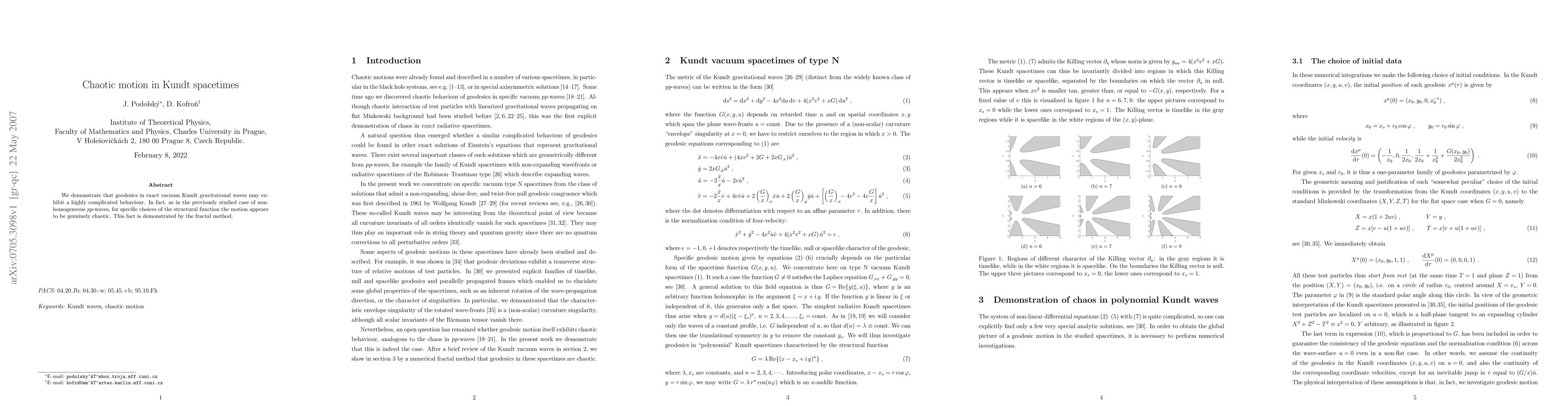 This paper investigates geodesics in exact vacuum Kundt gravitational waves, revealing that they can exhibit chaotic motion, similar to non-homogeneous pp-waves, demonstrated through fractal analysis. The study highlights the complex and unpredictable nature of the motion under specific structural conditions.