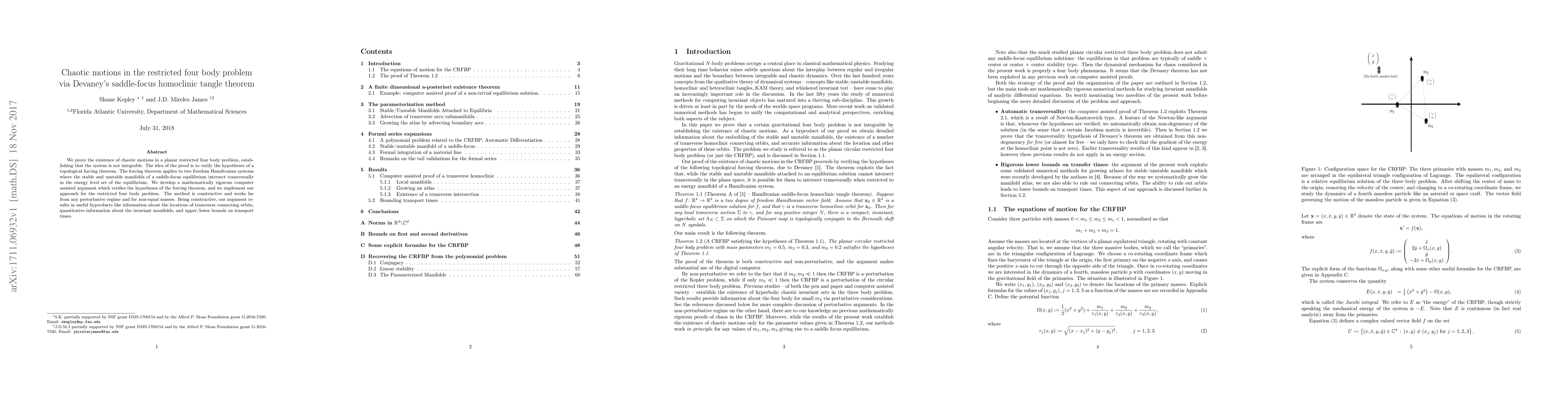 This paper proves the existence of chaotic motions in the planar restricted four body problem using Devaney's saddle-focus homoclinic tangle theorem. The authors verify the theorem's hypotheses through a rigorous computer-assisted argument, providing insights into transverse connecting orbits and transport times.