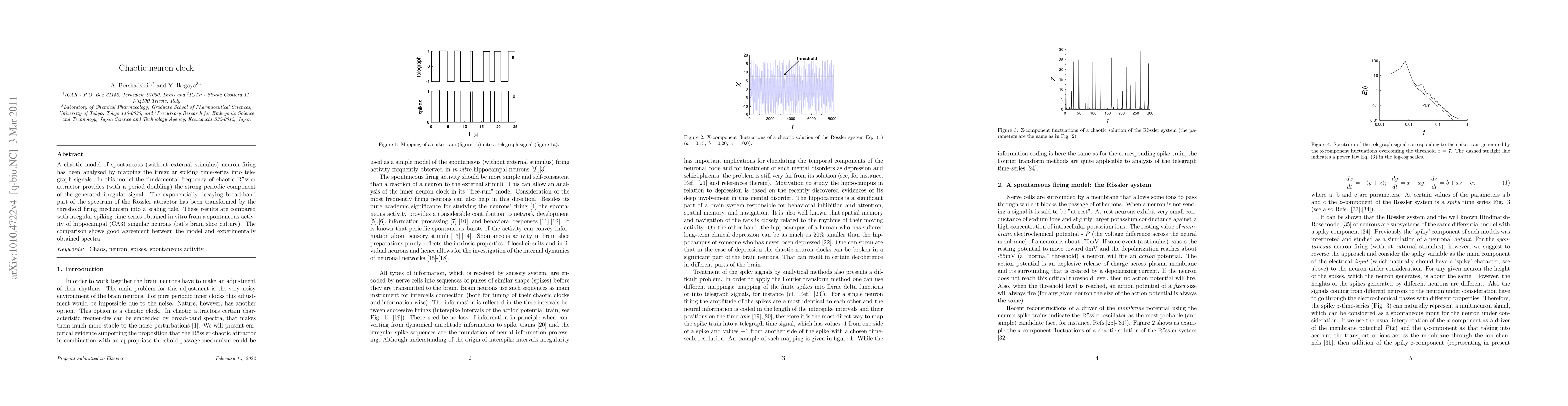 A simple threshold model of neuron firing (with the neuron membrane electrochemical potential governed by the chaotic Rossler attractor) has been analyzed by mapping the generated irregular spiking time-series into telegraph signals. In this model the fundamental frequency of the chaotic Rossler attractor provides (with a period doubling) the strong periodic component of the generated irregular signal. The exponentially decaying broad-band part of the spectrum of the Rossler attractor has been transformed by the threshold firing mechanism into a scaling tale. These results are compared with irregular spiking time-series obtained in vitro from a spontaneous activity of hippocampal (CA3) singular neurons (rat's brain slice culture). The comparison shows good agreement between the model and experimentally obtained spectra.