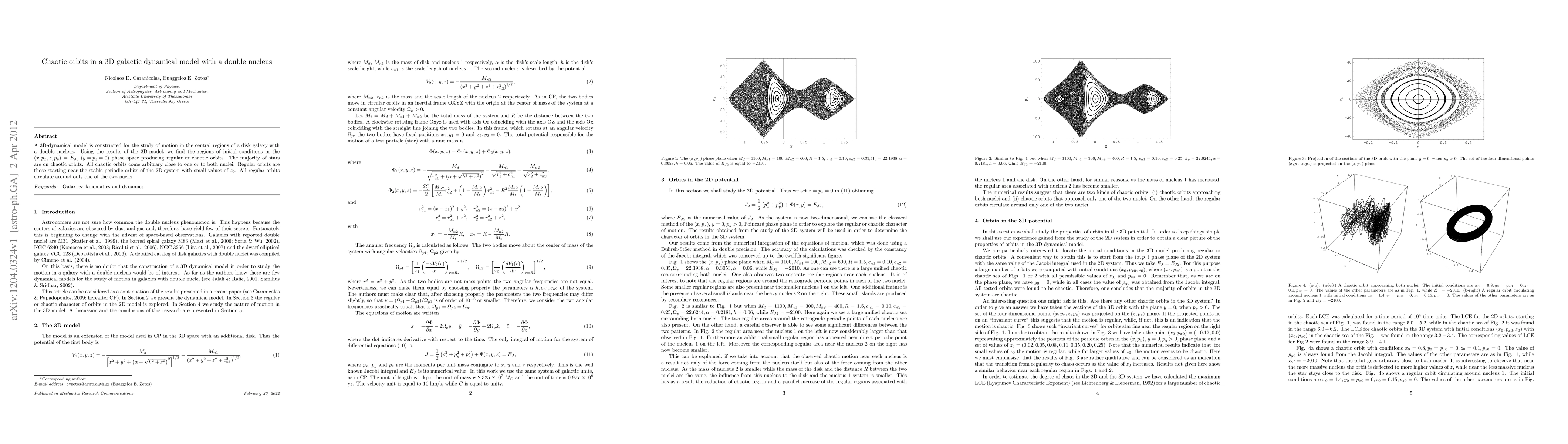 A 3D-dynamical model is constructed for the study of motion in the central regions of a disk galaxy with a double nucleus. Using the results of the 2D-model, we find the regions of initial conditions in the (x,px,z,py)=EJ, (y=pz=0) phase space producing regular or chaotic orbits. The majority of stars are on chaotic orbits. All chaotic orbits come arbitrary close to one or to both nuclei. Regular orbits are those starting near the stable periodic orbits of the 2D-system with small values of z0. All regular orbits circulate around only one of the two nuclei.