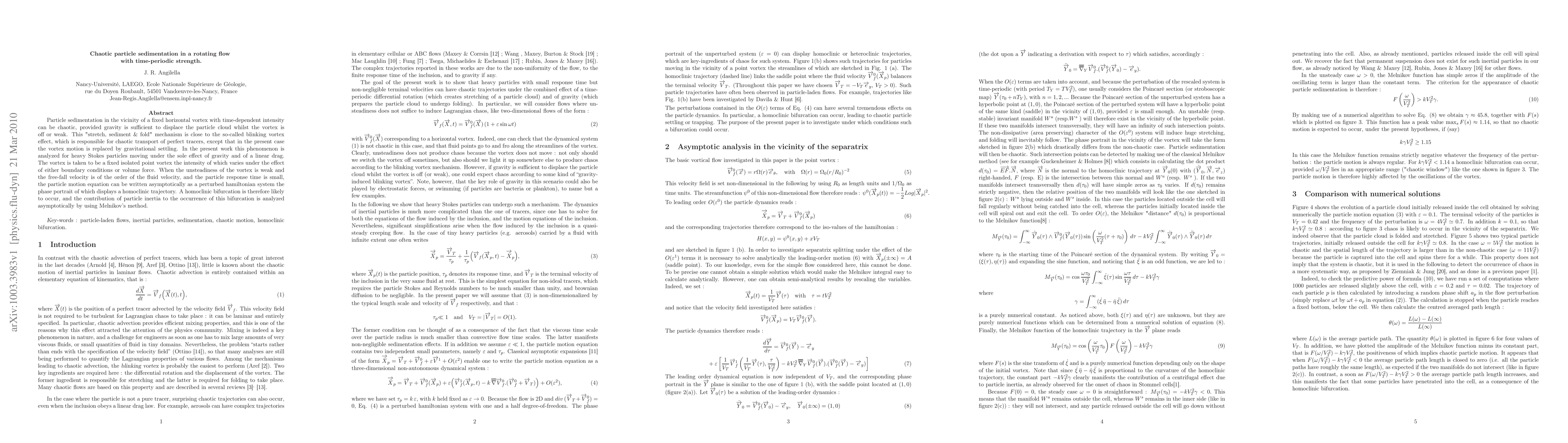 This paper investigates chaotic sedimentation of particles in a rotating flow with time-varying vortex strength, revealing a "stretch, sediment and fold" mechanism akin to the blinking vortex effect. The study focuses on heavy Stokes particles under gravity and linear drag, analyzing the impact of vortex unsteadiness and particle inertia on homoclinic bifurcations via Melnikov's method.