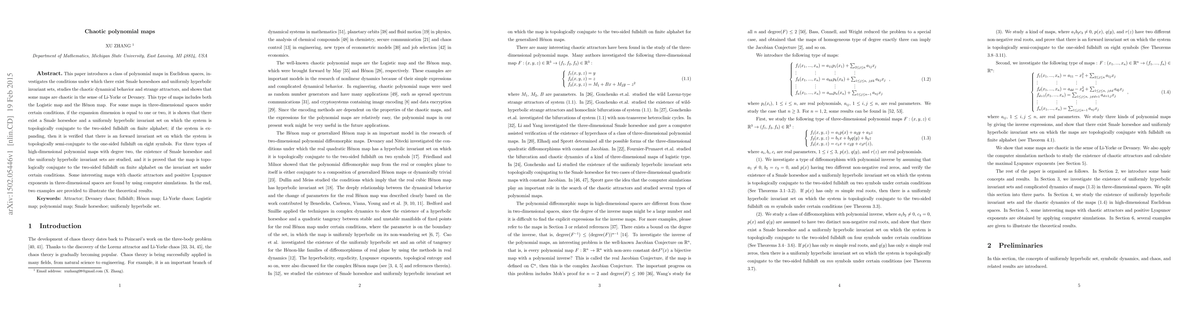 This paper explores chaotic polynomial maps in Euclidean spaces, identifying conditions for Smale horseshoes and uniformly hyperbolic sets, and demonstrating Li-Yorke or Devaney chaos. It finds topological conjugacy to fullshifts in high-dimensional maps and uses simulations to discover chaotic attractors in three-dimensional spaces.