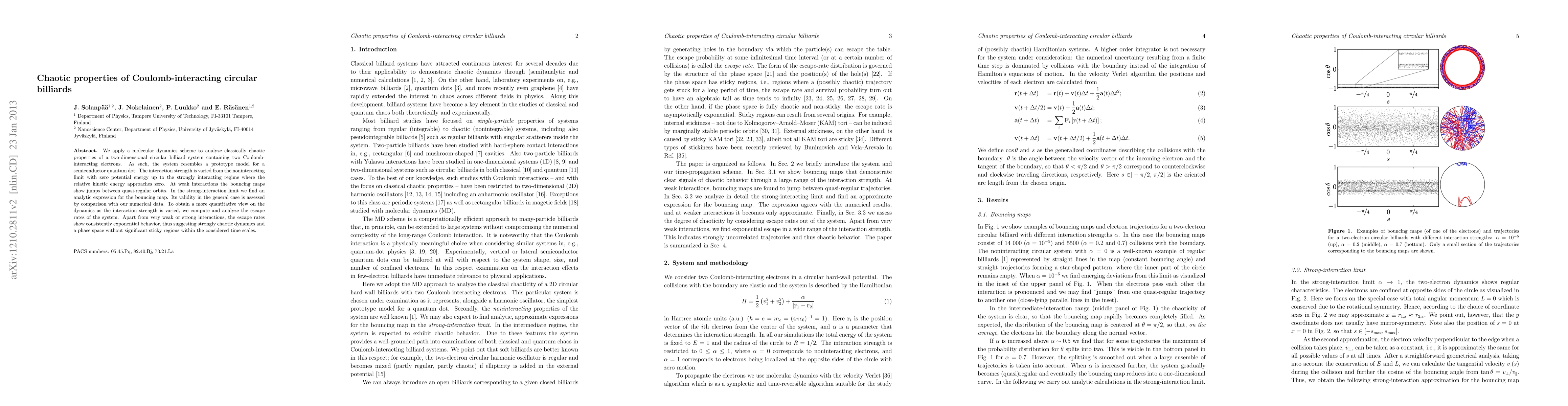 Researchers study a 2D circular billiard system with interacting electrons, finding chaotic behavior with varying interaction strength, and proposing an analytic expression for the bouncing map. They also analyze escape rates, which consistently show exponential behavior in most cases.