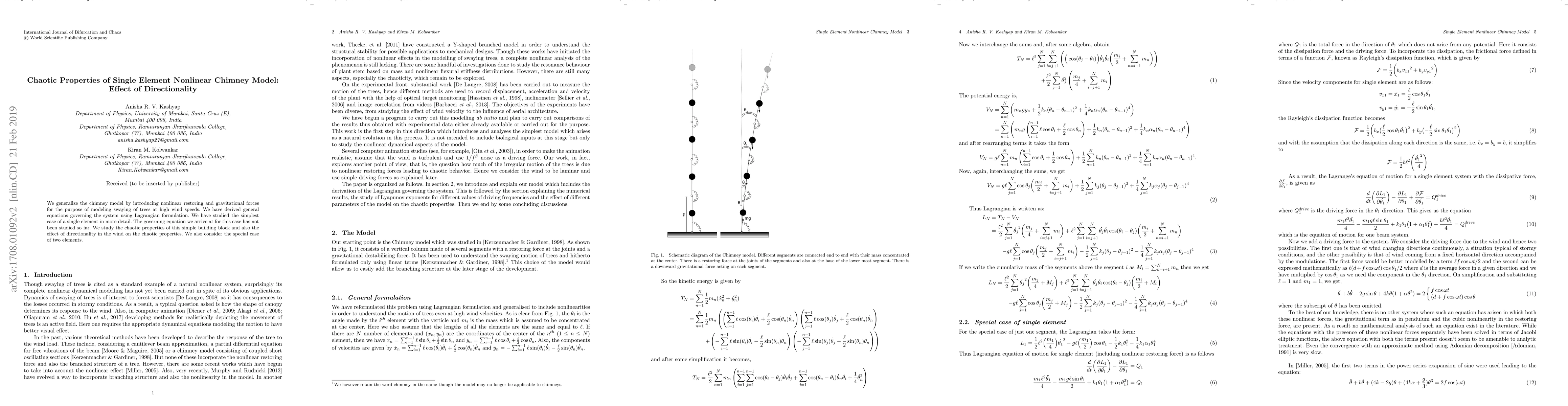 We generalize the chimney model by introducing nonlinear restoring and gravitational forces for the purpose of modeling swaying of trees at high wind speeds. We have derived general equations governing the system using Lagrangian formulation. We have studied the simplest case of a single element in more detail. The governing equation we arrive at for this case has not been studied so far. We study the chaotic properties of this simple building block and also the effect of directionality in the wind on the chaotic properties. We also consider the special case of two elements.