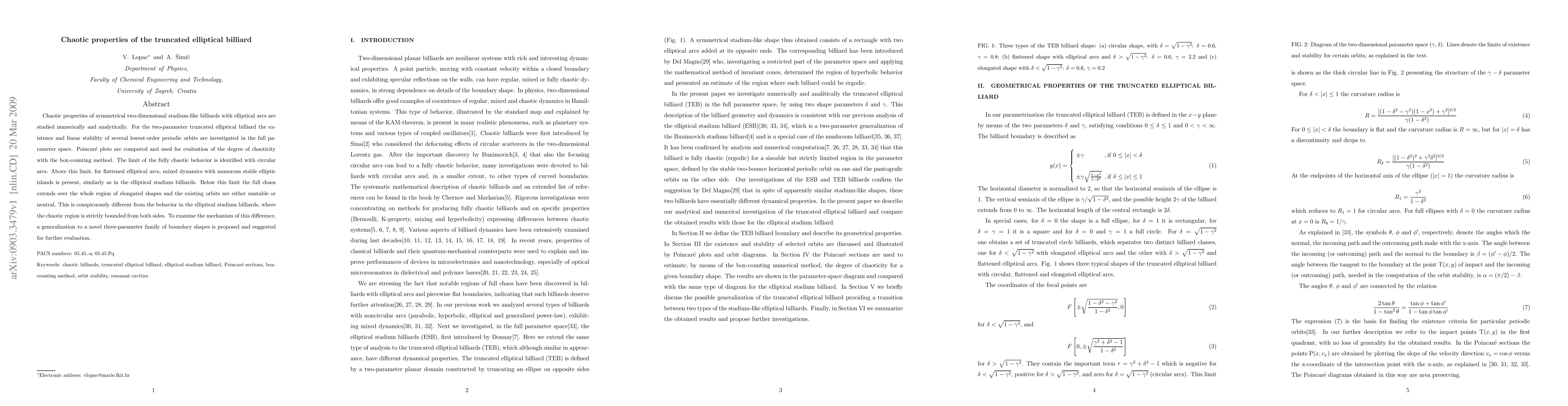 This paper investigates the chaotic dynamics of truncated elliptical billiards, identifying periodic orbits and their stability across parameter space. It finds mixed dynamics with chaotic and stable regions, contrasting with the strictly bounded chaotic regions in elliptical stadium billiards, and proposes a three-parameter boundary shape for further exploration.