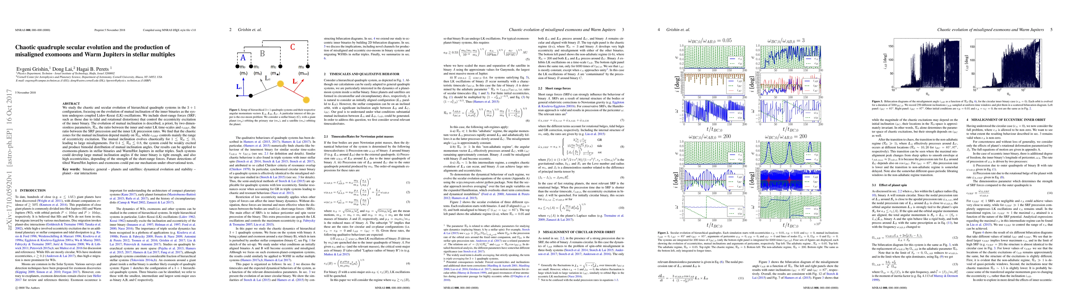 This paper investigates the chaotic secular evolution of quadruple star systems, particularly focusing on the mutual inclination of inner binaries undergoing Lidov-Kozai oscillations. It finds that chaotic evolution of mutual inclination is mainly governed by the ratio between inner and outer LK time-scales, potentially leading to large misalignments and high eccentricities in systems like exomoons and Warm Jupiters.