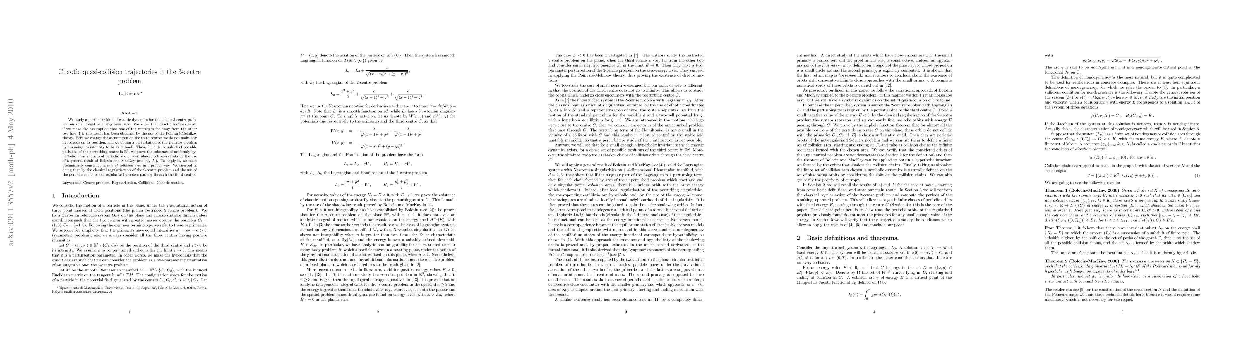 Researchers prove the existence of chaotic trajectories in a 3-centre problem with no assumptions on the third centre's position, finding hyperbolic invariant sets for periodic and chaotic orbits.