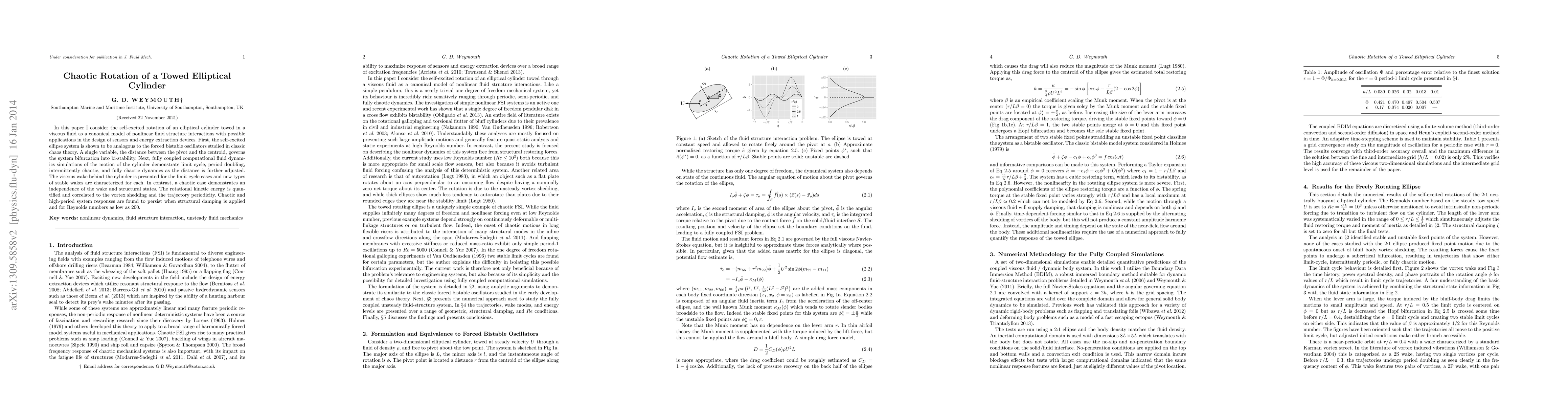 In this paper I consider the self-excited rotation of an elliptical cylinder towed in a viscous fluid as a canonical model of nonlinear fluid structure interactions with possible applications in the design of sensors and energy extraction devices. First, the self-excited ellipse system is shown to be analogous to the forced bistable oscillators studied in classic chaos theory. A single variable, the distance between the pivot and the centroid, governs the system bifurcation into bi-stability. Next, fully coupled computational fluid dynamics simulations of the motion of the cylinder demonstrate limit cycle, period doubling, intermittently chaotic, and fully chaotic dynamics as the distance is further adjusted. The viscous wake behind the cylinder is presented for the limit cycle cases and new types of stable wakes are characterized for each. In contrast, a chaotic case demonstrates an independence of the wake and structural states. The rotational kinetic energy is quantified and correlated to the vortex shedding and the trajectory periodicity. Chaotic and high-period system responses are found to persist when structural damping is applied and for Reynolds numbers as low as 200.