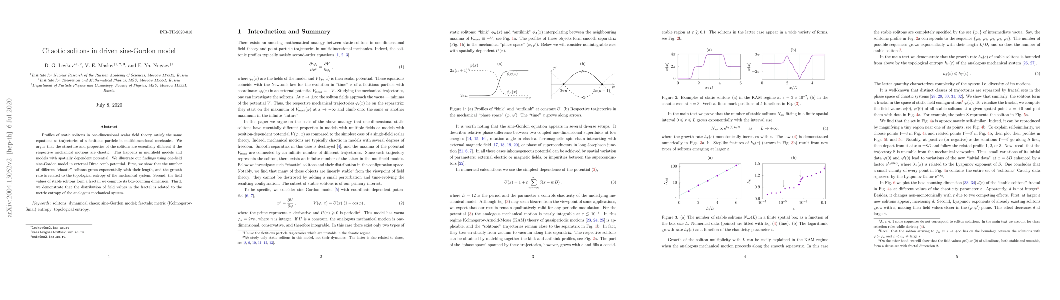 Profiles of static solitons in one-dimensional scalar field theory satisfy the same equations as trajectories of a fictitious particle in multidimensional mechanics. We argue that the structure and properties of the solitons are essentially different if the respective mechanical motions are chaotic. This happens in multifield models and models with spatially dependent potential. We illustrate our findings using one-field sine-Gordon model in external Dirac comb potential. First, we show that the number of different "chaotic" solitons grows exponentially with their length, and the growth rate is related to the topological entropy of the mechanical system. Second, the field values of stable solitons form a fractal; we compute its box-counting dimension. Third, we demonstrate that the distribution of field values in the fractal is related to the metric entropy of the analogous mechanical system.