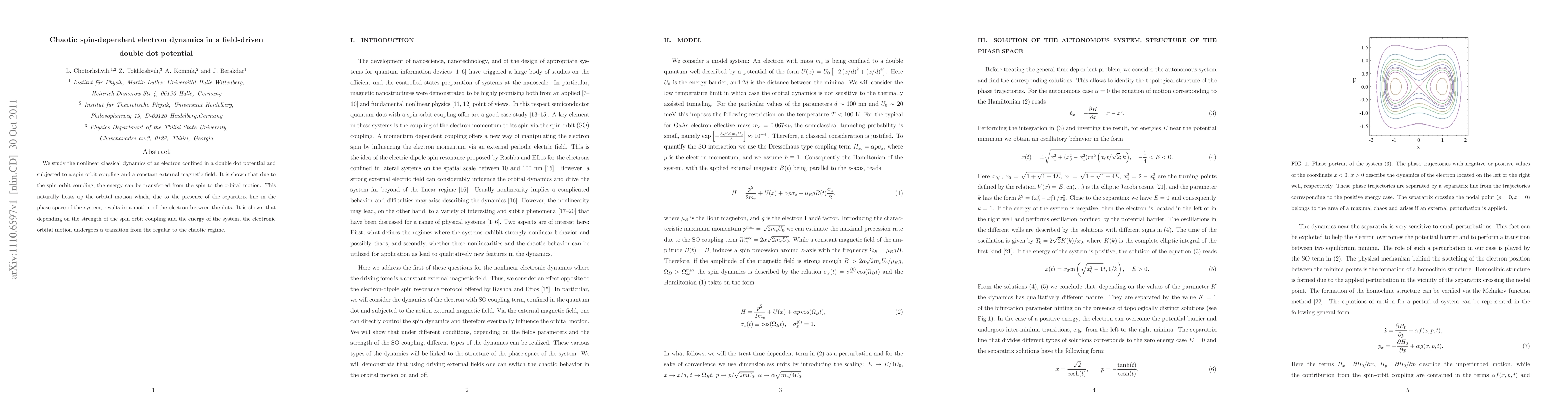 We study the nonlinear classical dynamics of an electron confined in a double dot potential and subjected to a spin-orbit coupling and a constant external magnetic field. It is shown that due to the spin orbit coupling, the energy can be transferred from the spin to the orbital motion. This naturally heats up the orbital motion which, due to the presence of the separatrix line in the phase space of the system, results in a motion of the electron between the dots. It is shown that depending on the strength of the spin orbit coupling and the energy of the system, the electronic orbital motion undergoes a transition from the regular to the chaotic regime.