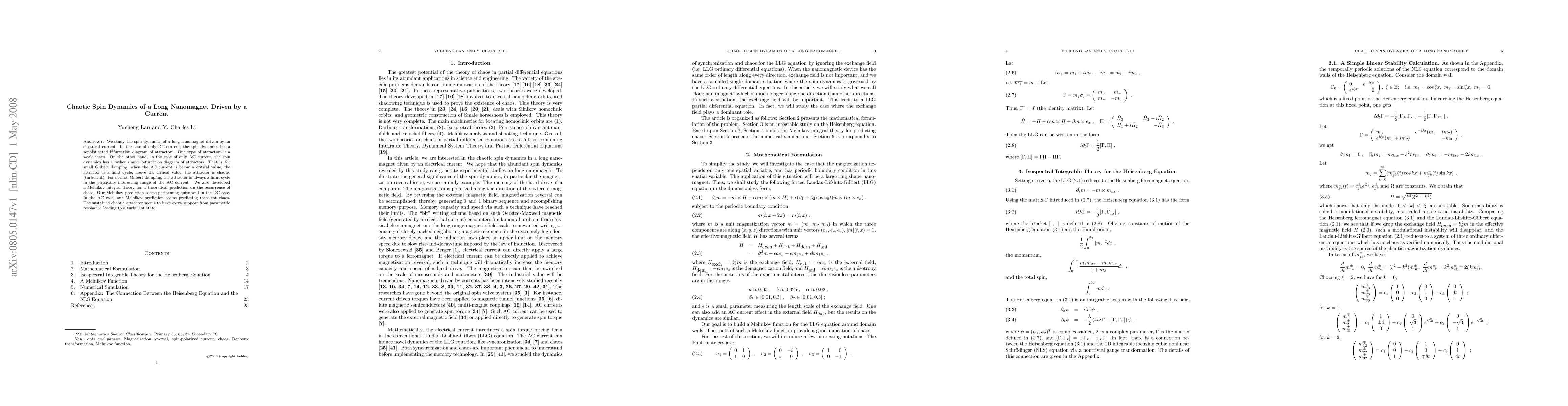 We study the spin dynamics of a long nanomagnet driven by an electrical current. In the case of only DC current, the spin dynamics has a sophisticated bifurcation diagram of attractors. One type of attractors is a weak chaos. On the other hand, in the case of only AC current, the spin dynamics has a rather simple bifurcation diagram of attractors. That is, for small Gilbert damping, when the AC current is below a critical value, the attractor is a limit cycle; above the critical value, the attractor is chaotic (turbulent). For normal Gilbert damping, the attractor is always a limit cycle in the physically interesting range of the AC current. We also developed a Melnikov integral theory for a theoretical prediction on the occurrence of chaos. Our Melnikov prediction seems performing quite well in the DC case. In the AC case, our Melnikov prediction seems predicting transient chaos. The sustained chaotic attractor seems to have extra support from parametric resonance leading to a turbulent state.
