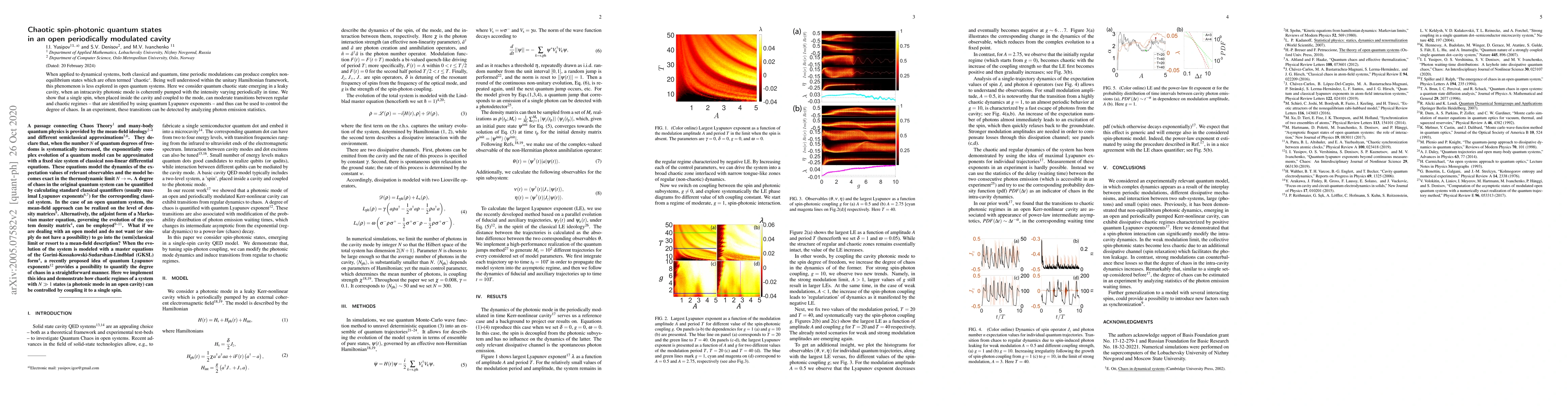 This research investigates chaotic spin-photonic states in an open quantum cavity subjected to time-periodic modulation, demonstrating how a single spin within the cavity can control transitions between regular and chaotic dynamics, as identified by quantum Lyapunov exponents, with potential experimental detection through photon emission statistics.